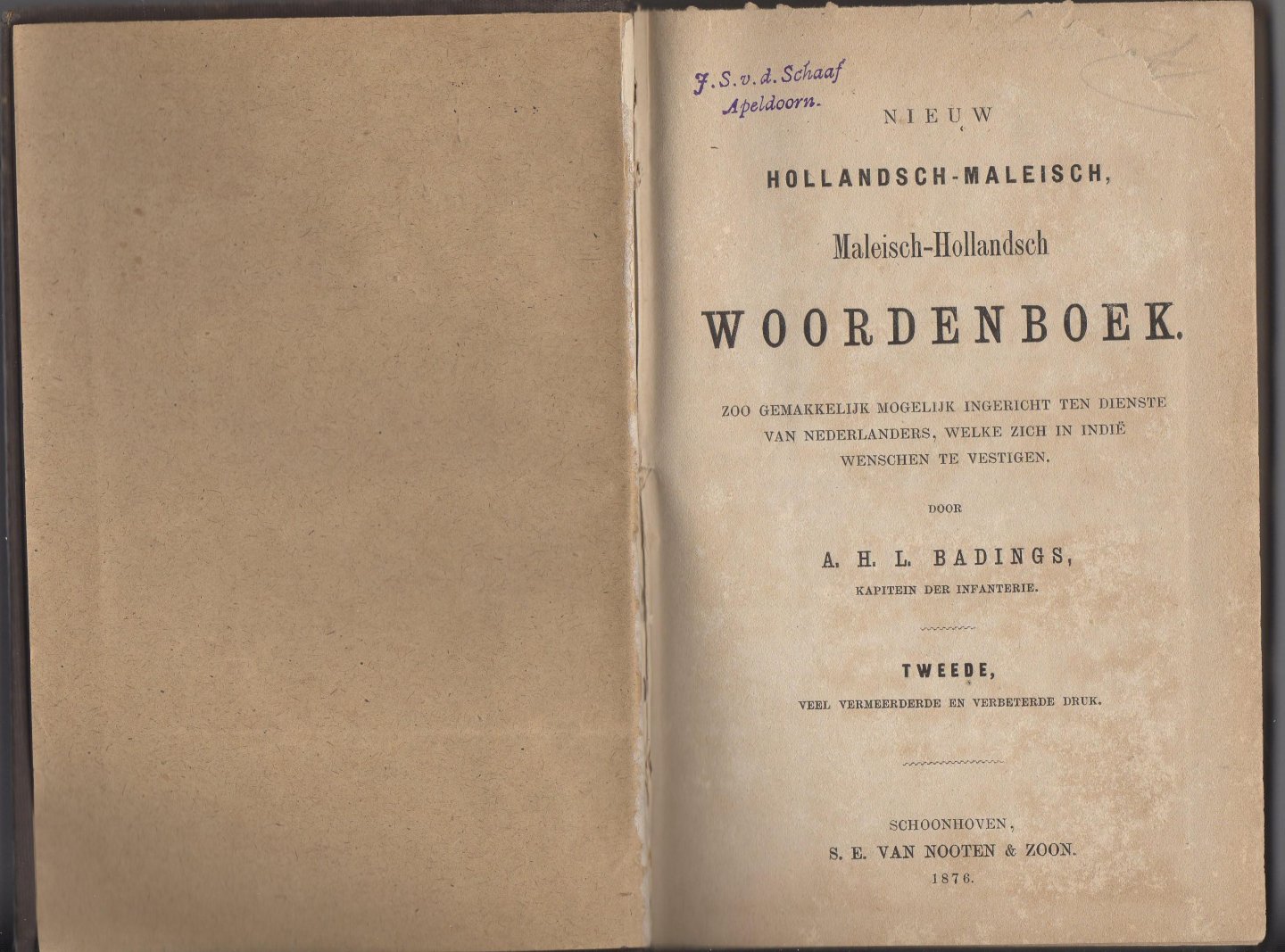 het woordenboek uit 1876 is nog in orginele band welke licht beschadigt is op de rug , bovendien zijn de hoekjes en randen beschadigt.Toch ziet het geheel er redelijk uit , zeldzaam woordenboek in de 2de druk. Door Badings, het was bedoelt voor mensen die naar Indie emigreerden.Het titelblad is qua tekst kompleet met stempel van eerdere eigenaar, alleen bovenaan is een stukje afgescheurd.Afmeting 13 bij 18.5 cm 380 blz 2.5 cm dik.