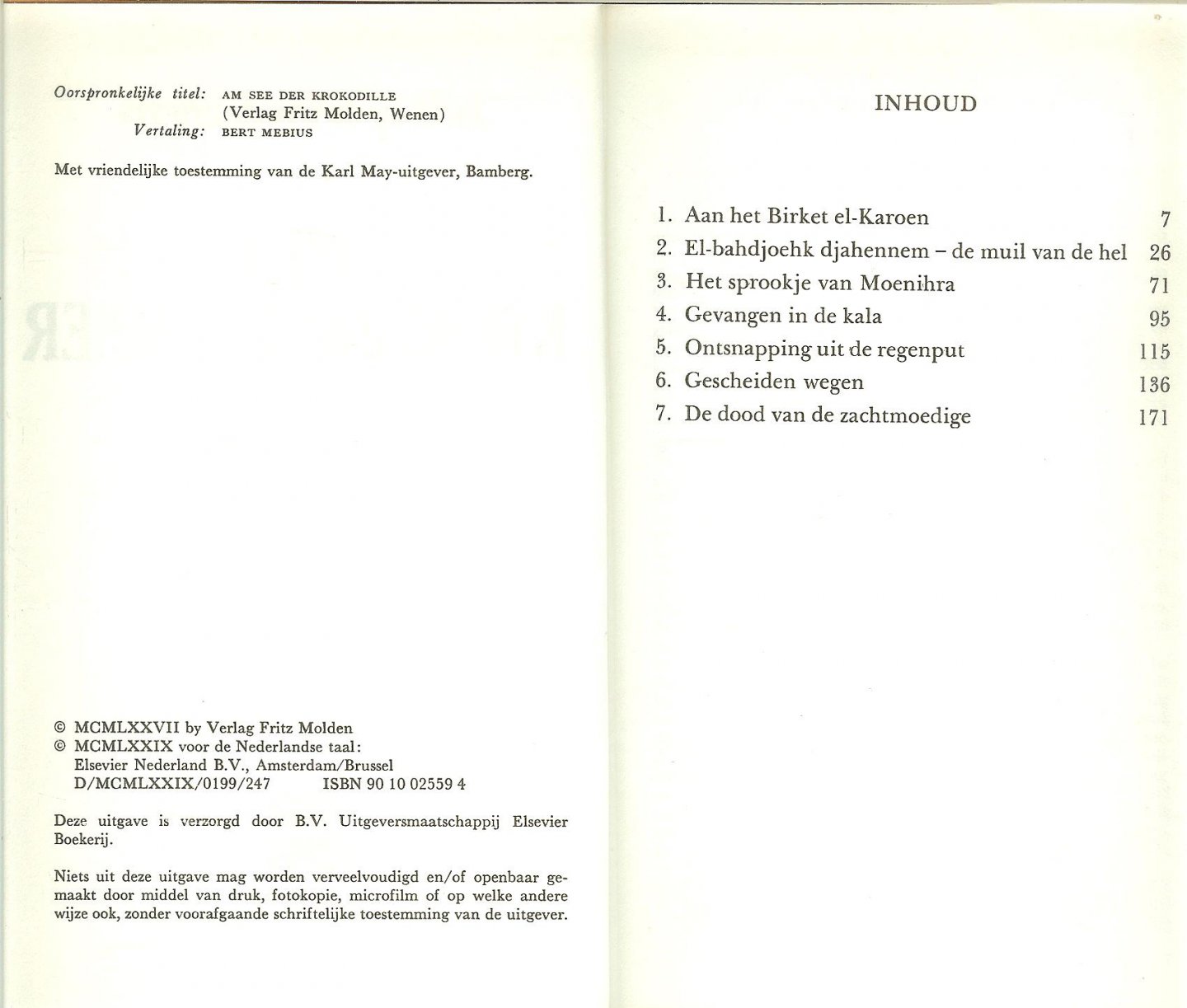 Am see der Krokodille Oorspronkelijke Titel Verlag Fritz Molden Wenen Met vriendelijke toestemming van de Karl May-uitgeverij Bamberg uit de serie: jacht op de woestijnrovers een vervolg op de reisverhalen van Karl May, de gebeurtenissen spelen in het Egypte van 1932 |