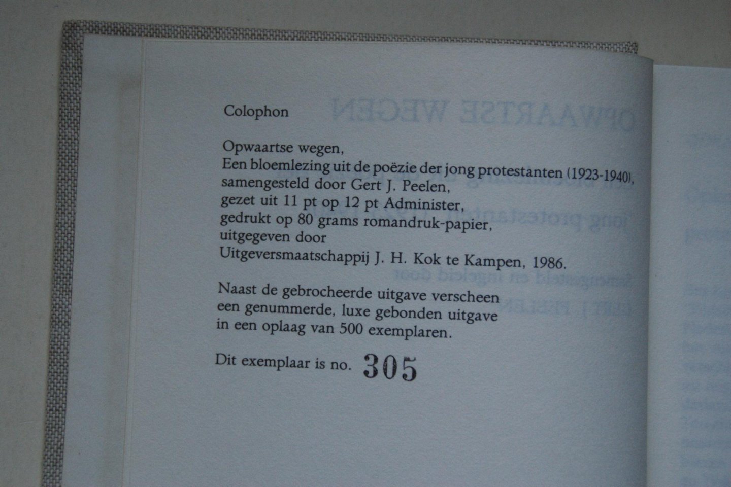 | Titel: | bloemlezing uit de poezie der jong-protestanten 1923 - 1940 Opwaartse Wegen met inleiding van Gert J. Peelen Genummerd Exemplaar no. 305 Luxe Gebonden Uitgave |