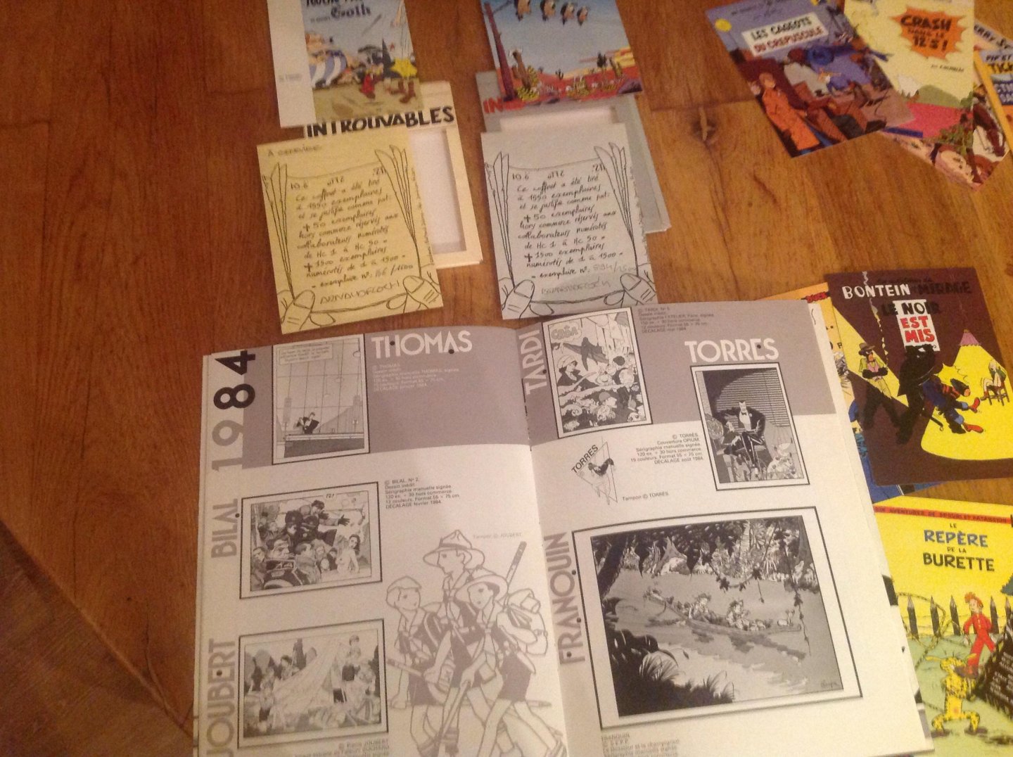 | Meer info: | Naast de genummerde catalogus ook de beide kaartsetjes van Trhan getiteld Les Introuvables en Les Nouveau Introuvables met elk acht kaarten en verantwoordingsblad genummerd en gesigneerd door Floch. De kaarten geven niet bestaande nepafbeeldingen van bekende stripfiguren weer. |