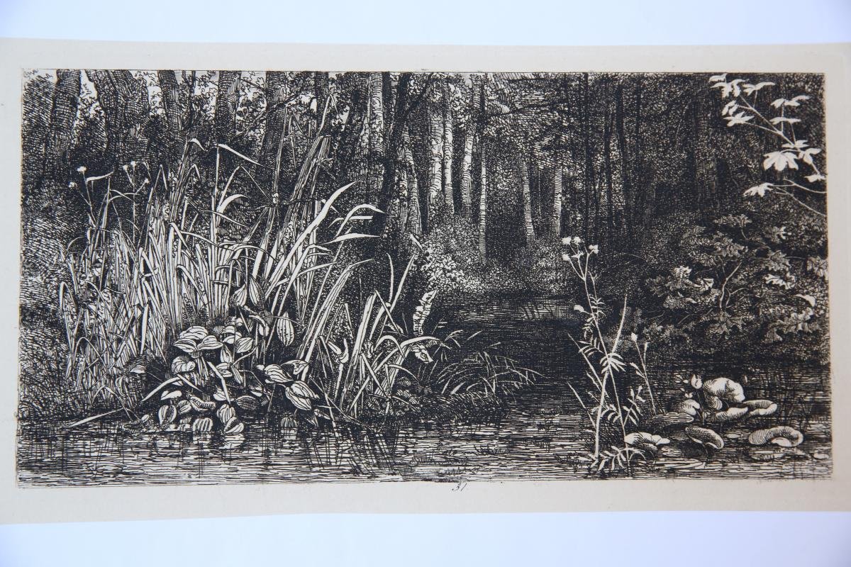 | Bijzonderheden: | Woods, vegetation and a calm stream of water. Beautiful composition, nice contrast between darker and lighter areas. Numbered below: '31.' |