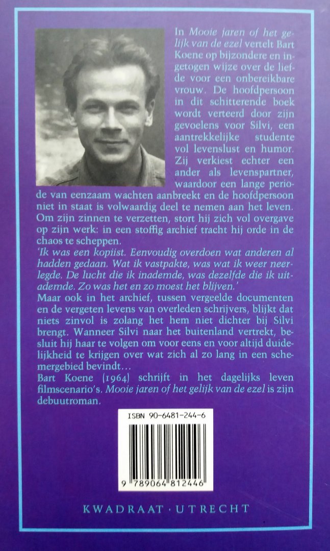 (Kwadraat - Utrecht) ISBN 9064812446 uitgave uit 1995 220 pp paperback (leessporen op de rug, verder goed!) Staat van het boek: 7.5 In Mooie jaren of het gelijk van de ezel vertelt Bart Koene op bijzondere en ingetogen wijze over de liefde voor een onbereikbare vrouw. De hoofdpersoon in dit schitterende boek wordt verteerd door zijn gevoelens voor Silvi, een aantrekkelijke studente vol levenslust en humor. Zij verkiest echter eew ander als levenspartner, waardoor een lange periode van eenzaam wachten aanbreekt en de hoofdpersoon-, niet in staat is volwaardig deel te nemen aan het leven. Om zijn zinnen te verzetten, stort hij zich vol overgave op zijn werk: in een stoffig archief tracht hij orde in de chaos te scheppen. Ik was een kopiist. Eenvoudig overdoen wat anderen al hadden gedaan. Wat ik vastpakte, was wat ik weer neerlegde. De lucht die ik inademde, was dezelfde die ik uitademde. Zo was het en zo moest het blijven.' Maar ook in het archief, tussen vergeelde documenten en de vergeten levens van overleden schrijvers, blijkt dat niets zinvol is zolang het hem niet dichter bij Silvi brengt. Wanneer Silvi naar het buitenland vertrekt, besluit hij haar te volgen om voor eens en voor altijd duidelijkheid te krijgen over wat zich al zo lang in een schemergebied bevindt...Recensie(s)Roman over een relatie die tot de laatste bladzijde op vervulling wacht. De hoofdfiguur adoreert reeds lange tijd een medestudente, maar zij prefereert zijn beste vriend en raakt vervolgens via een andere relatie nog verder van hem verwijderd. Tijdens een gemeenschappelijke vakantie geraken zij echter toch nog bijeen. Het verhaal bevat een veelheid aan emoties, is qua inhoud nogal triviaal en herinnert voortdurend aan eerder gelezen romans en reeds aanschouwde films. Toch is dit, ondanks alle clichématigheid, een alleszins onderhoudende roman uit de categorie 'betere soap' en als zodanig genietbaar voor vele lezers die geen al te hoge eisen stellen aan oorspronkelijkheidsgehalte en literair niveau. Het omslag van deze onmiskenbaar vlot vertelde roman vertoont, naast de gebruikelijke gegevens, een deel van een schilderij van Cézanne. (Biblion recensie, T. Zijlstra.) Prijs €4,- |