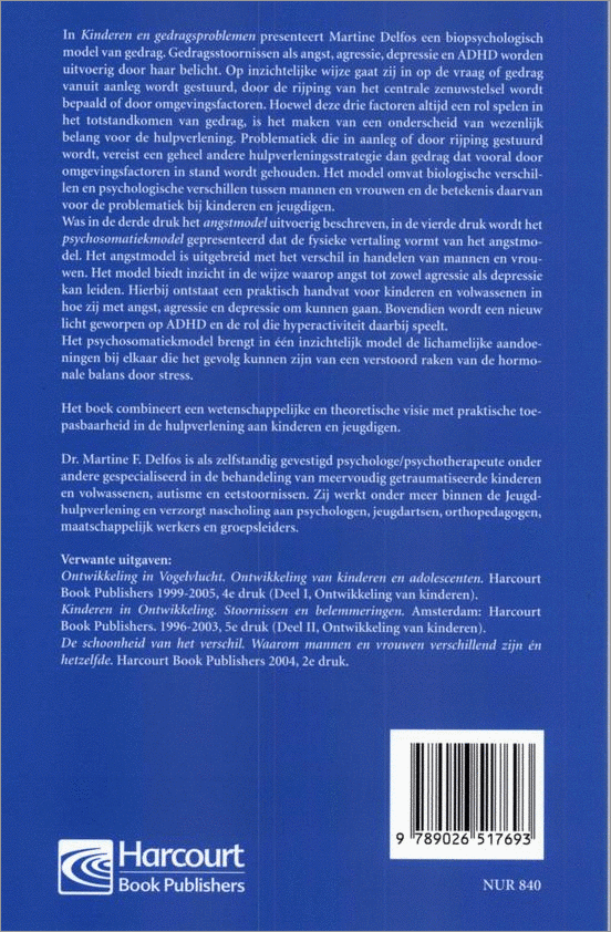 - In Kinderen en gedragsproblemen presenteert Martine Delfos een biopsychologisch model van gedrag. Gedragsstoornissen als angst, agressie, depressie en ADHD worden uitvoerig door haar belicht. Op inzichtelijke wijze gaat zij in op de vraag of gedrag vanuit aanleg wordt gestuurd, door rijping van het centrale zenuwstelsel wordt bepaald of door omgevingsfactoren. Hoewel deze drie factoren altijd een rol spelen in het totstandkomen van gedrag, is het maken van een onderscheid van wezenlijk belang voor de hulpverlening. Problematiek die in aanleg of door rijping gestuurd wordt, vereist een geheel andere hulpverleningsstrategie dan gedrag dat vooral door omgevingsfactoren in stand wordt gehouden. Het model omvat biologische verschillen tussen mannen en vrouwen en de betekenis daarvan voor de problematiek bij kinderen en jeugdigen.