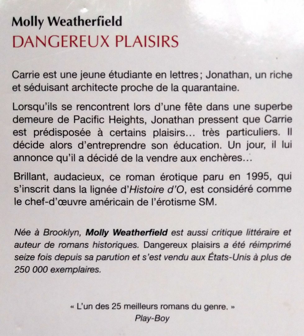 (Archipoche) ISBN 9782352876106 uitgave uit 2014 281 pp pocket (in goede staat!) Staat van het boek: 8.0 Carrie est une étudiante en lettres. Jonathan, un trader d'une quarantaine d'années, un homme accompli. Ils font connaissance lors d'une soirée au cours de laquelle est diffusé un film SM. Jonathan devine que Carrie est troublée par les scènes de soumission masochiste - c'est le cas. Il l'invite alors chez lui où elle consent, par contrat, à devenir son esclave. Au moment où s'ouvre le roman, Jonathan informe Carrie qu'il a l'intention, maintenant qu'il l'a dressée, de la vendre aux enchères. Une fois vendue, lui explique-t-il, elle sera pendant une année l'esclave exclusive et soumise de son richissime acheteur. Début du flash-back relatant les différentes étapes du dressage menant à la vente aux enchères, dont ce stage dans un ranch californien. Carrie s'y retrouve en compagnie d'autres jeunes femmes. Elles dorment dans des boxes, sont fouettées... Bref, elles apprennent l'obéissance pour le plaisir exclusif de leur maître. Prijs €4,- |