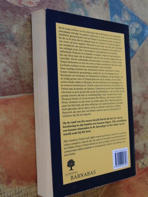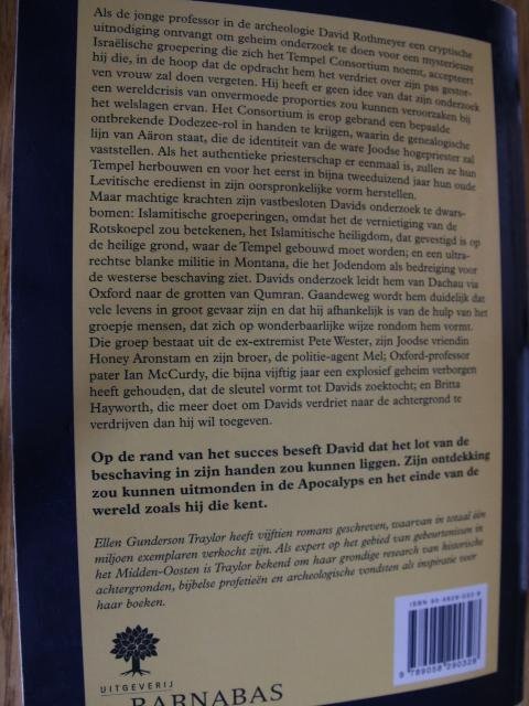 Als de jonge professor in, de archeologie David Rothmeyer een cryptische uitnodiging ontvangt om geheim onderzoek te doen voor een mysterieuze Israëlische groepering die zich het Tempel Consortium noemt, accepteert hij die, in de hoop dat de opdracht hem het verdriet over zijn pas gestorven vrouw zal doen vergeten. Hij heeft er geen idee van dat zijn onderzoek een wereldcrisis van onvermoede proporties zou kunnen veroorzaken bij het welslagen ervan. Het Consortium is erop gebrand een bepaalde ontbrekende Dodezee - rol in handen te krijgen, waarin de genealogische lijn van Aäron staat, die de identiteit van de ware joodse hogepriester zal vaststellen. Als het authentieke priesterschap er eenmaal is, zullen ze hun Tempel herbouwen en voor het eerst in bijna tweeduizend jaar hun oude Levitische eredienst in zijn oorspronkelijke vorm herstellen. Maar machtige krachten zijn vastbesloten Davids onderzoek te dwarsbomen: Islamitische groeperingen, omdat het de vernietiging van de Rotskoepel zou betekenen, het Islamitische heiligdom, dat gevestigd is op de heilige grond, waar de Tempel gebouwd moet worden; en een ultrarechtse blanke militie in Montana, die het Jodendom als bedreiging voor de westerse beschaving ziet. Davids onderzoek leidt hem van Dachau via Oxford naar de grotten van Qumran. Gaandeweg wordt hem duidelijk dat vele levens in groot gevaar zijn en dat hij afhankelijk is van de hulp van het groepje mensen, dat zich op wonderbaarlijke wijze rondom hem vormt. Die groep bestaat uit de ex-extremist Pete Wester, zijn joodse vriendin Honey Aronstam en zijn broer, de politie - agent Mel; Oxford - professor pater Ian McCurdy, die bijna vijftig jaar een explosief geheim verborgen heeft gehouden, dat de sleutel vormt tot Davids zoektocht; en Britta Hayworth, die meer doet om Davids verdriet naar de achtergrond te verdrijven dan hij wil toegeven. Op de rand van het succes beseft David dat het lot van de beschaving in zijn handen zou kunnen liggen. Zijn ontdekking zou kunnen uitmonden in de Apocalyps en het einde van de wereld zoals hij die kent. Toon minder Recensie(s) Professor Rothmeyer wordt verzocht onderzoek te doen naar ontbrekende schakels in de stamboom van de joodse hogepriesters. Hij wordt daartoe uitgenodigd door het Tempel Consortium, een mysterieuze Israëlische groepering die ook de tempel wil herbouwen. Tegelijkertijd vinden er in de V.S. racistische bijeenkomsten plaats. Een hoofdrolspeelster hierbij is in het bezit van belangrijke informatie over de stamboom. De speurtocht voert naar Israël, Dachau en Engeland, waar een priester, een archeoloog die de Dode-Zeerollen heeft bestudeerd, een stuk informatie bezit. Het zijn vier verhaallijnen die wat al te toevallig bij elkaar komen. De schrijfster kan ook een teveel aan sentimentaliteit verweten worden en het wereldwijde complot van Arabieren en antisemieten is niet erg geloofwaardig. Overigens een knap verhaal met een goede spanningsopbouw. Wat betreft de archeologie van de bijbel en de huidige situatie binnen het jodendom is het boek interessant en actueel, met goed geportretteerde hoofdpersonen. De schrijfster is Midden-Oosten expert en heeft heel wat research moeten doen om dit boek te kunnen schrijven. Kleine druk. (Biblion recensie, G.P. Schuring) |