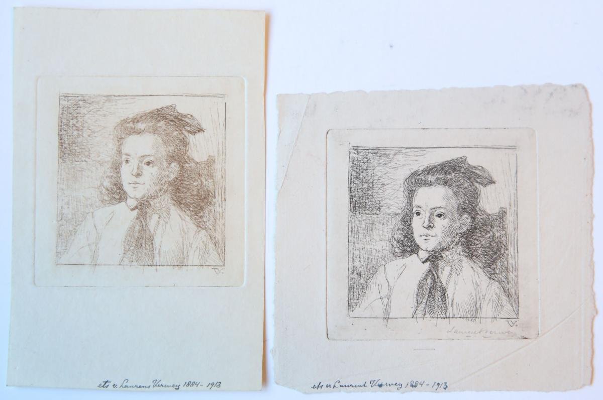 | Bijzonderheden: | Portrait of a young girl seated on a chair, wearing a large bow on her head. In white shirt with dark tie. Two impressions in two different tonalities: one black and the other brown.Monogrammed on bottom right: 'LV'. Before 1913. |