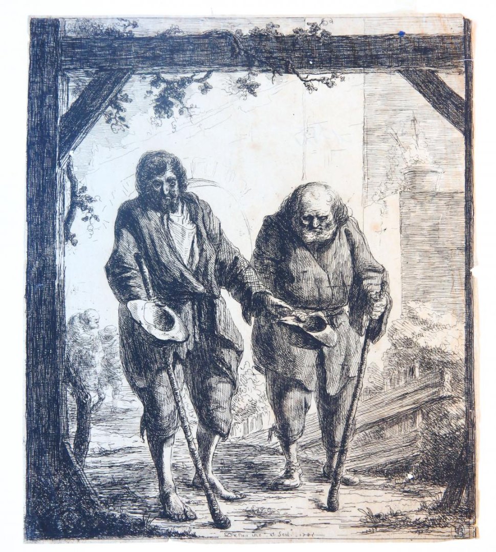 | Bijzonderheden: | Two beggars in a courtyard, holding walking sticks and hats to collect offers on the street. Very interesting and rare etching. Signed and dated at the bottom: "DeNon inu et Scul. - 1782." Various collector's marks: on the recto, bottom right: Alf... |