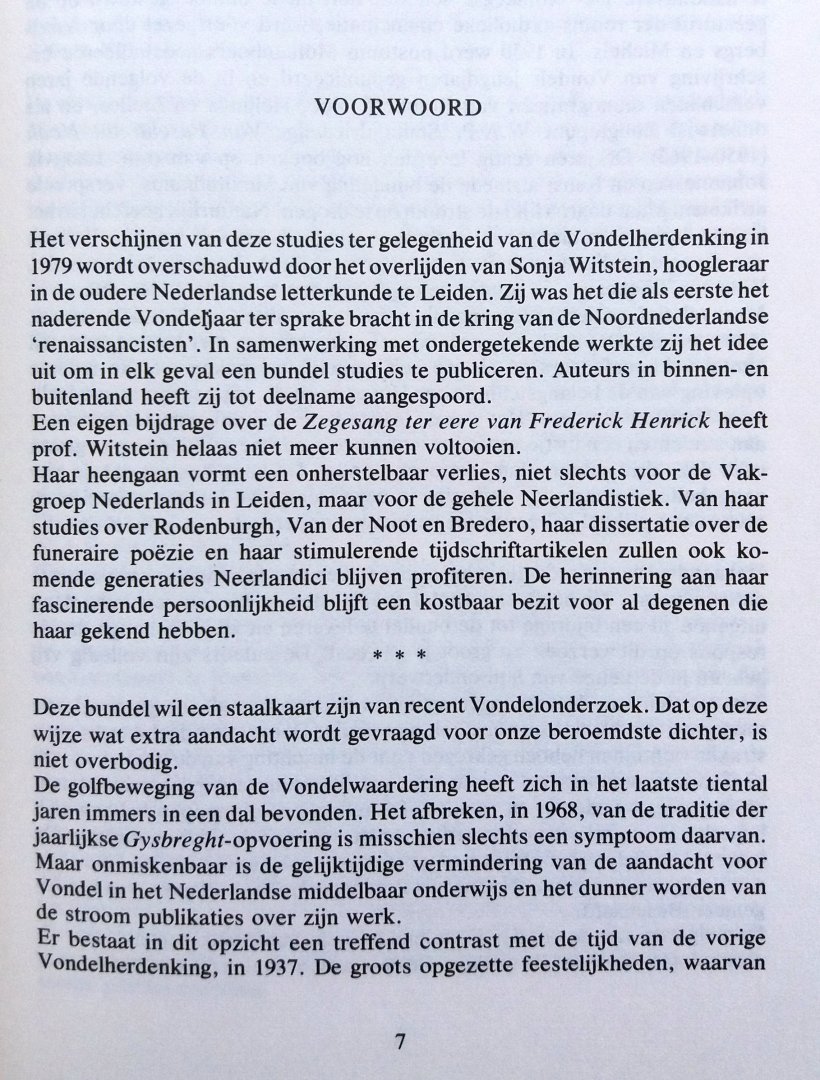 (Een bundel artikelen verzameld door S.F. Witstein & E.K. Grootes ter gelegenheid van de driehonderdste sterfdag van Joost van den Vondel) (Martinus Nijhoff / Tjeenk Willink Noorduijn - Den Haag) ISBN 9024721873 uitgave uit 1979 327 pp paperback (in goede staat!, geen inschriften) Staat van het boek: 8.5 Zestien doorwrochte studies van binnen- en buitenlandse auteurs, deels uitgaande van een werk van Vondel, deels een groep werken behandelend. Daarin treedt natuurlijk het begrip "Visie" het duidelijkst aan het licht, bijvoorbeeld in de merkwaardige bijdrage die een psycho-analytische interpretatie van Vondels drama beproeft. Het niveau van alle artikelen is hoog tot zeer hoog, enkele vereisen bijzondere kennis van Latijn (Vondel en Vergilius) of van Vondels Godsbegrip (Lucifer, Altaergeheimenissen, Bespiegelingen). De beschouwingen over Bruyloftbed (1627), De Beemster (1644), De Aenleidinge (1650) enz. zijn gemakkelijker toegankelijk. Deze "staalkaart van recent Vondelonderzoek" stelt hoge eisen aan de lezer, maar opent hem ook belangrijke perspectieven. Prijs €4,50 |
