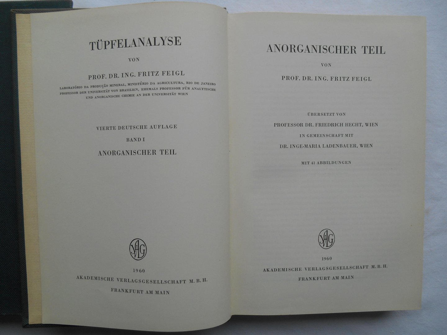 Feigl, Prof. Fritz - Tüpfelanalyse, 2 Bande, komplett