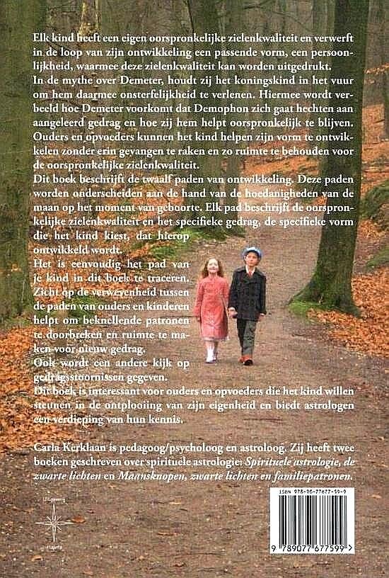 In de mythe over Demeter, houdt zij het koningskind in het vuur om hem daarmee onsterfelijkheid te verlenen. Hiermee wordt verbeeld hoe Demeter voorkomt dat Demophon zich gaat hechten aan aangeleerd gedrag en hoe zij hem helpt oorspronkelijk te blijven. Ouders en opvoeders kunnen het kind helpen zijn vorm te ontwikkelen zonder er in gevangen te raken en zo ruimte te behouden voor de oorspronkelijke zielenkwaliteit Dit boek beschrijft de twaalf paden van ontwikkeling. Deze paden worden onderscheiden aan de hand van de hoedanigheden van de maan op het moment van geboorte. Elk pad beschrijft de oorspronkelijke zielenkwaliteit en het specifieke gedrag, de specifieke vorm die het kind kiest, dat hierop ontwikkeld wordt. Het is eenvoudig het pad van je kind in dit boek te traceren. Zicht op de verwevenheid tussen de paden van ouders en kinderen helpt om beknellende patronen te doorbreken en ruimte te maken voor nieuw gedrag. Ook wordt een andere kijk op gedragsstoornissen gegeven. Dit boek is interessant voor ouders en opvoeders die het kind willen steunen in de ontplooiing van zijn eigenheid en biedt astrologen een verdieping van hun kennis. Carla Kerklaan is pedagoog/psycholoog en astroloog. Zij heeft twee boeken geschreven over spirituele astrologie: Spirituele astrologie, de zwarte lichten en Maansknopen, zwarte lichten en familiepatronen. Voor meer informatie: www.kernwerk-astro.nl |