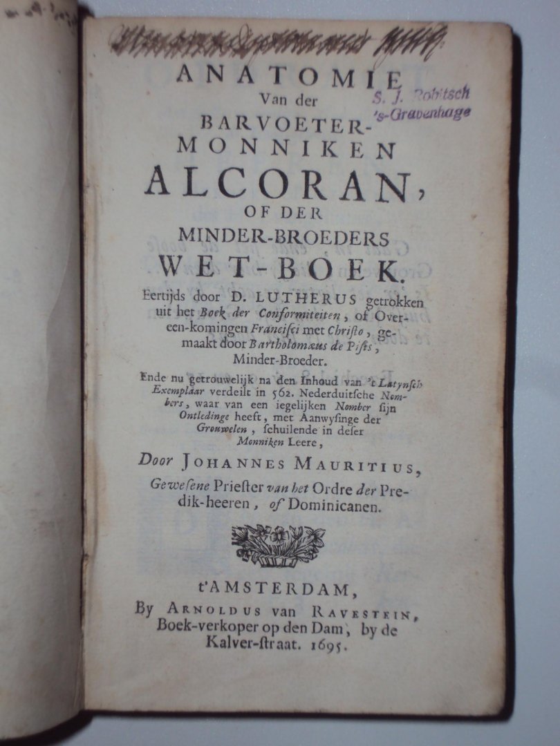 Johannes Mauritius - Anatomie van der barvoeter monniken Alcoran, of der minder-broeders wetboek. Eertijds door D. Lutherus getrokken uit het boek der Conformiteiten of overeenkomingen Francisci met Chisto, gemaakt door Bartholomeus de Pifis, minder-broeder. Ende nu getrouwelijk na den inhoud van 't Latynsch exemplaar verdeilt in 562 Nederduitsche nombers, waar van een iegelijken nomber sijn ontledinge heeft, met aanwysinge der grouwelen, schuilende in deser monniken leere - Amsterdam, Arnoldus van Ravestein, 1695 - 500 pp - perkament / vellum band - 16 x 10 cm