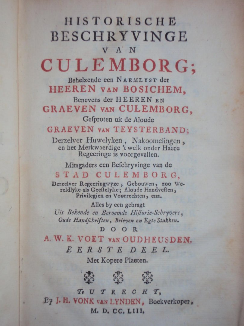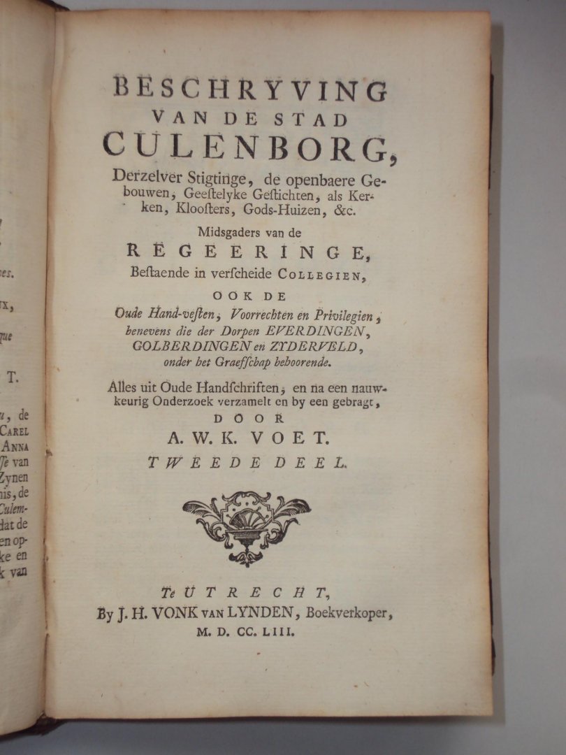 gebonden met: A.W.K. Voet - Beschryving van de stad Culenborg, derzelver stigtinge, de openbaere gebouwen, geestelyke gestichten als kerken, kloosters, godshuien etc. Mitsgaders van de regeeringe bestaende in verscheide collegien, ook de oude hand-vesten, voorrechten en privilegien benevens die der dorpen Everdingen, Golberdingen en Zyderveld - Utrecht, J.H. Vonk van Lynden, 1753 compleet met alle illustraties |