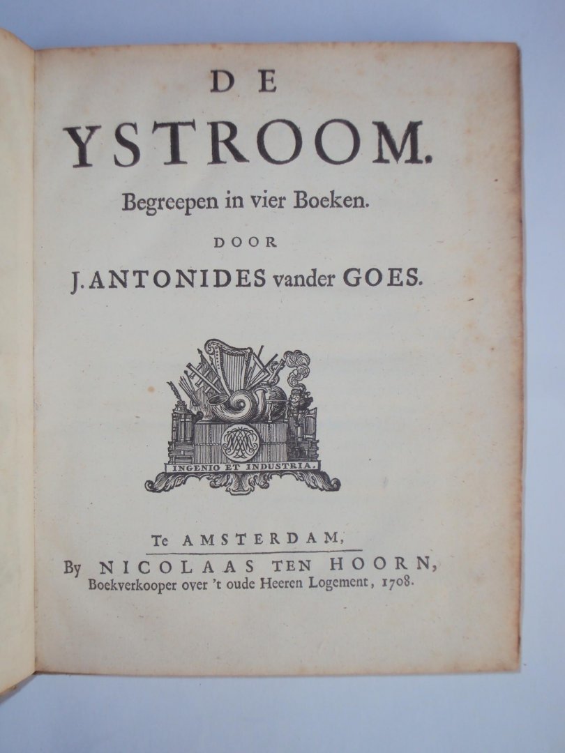 J. Antonides van der Goes - De Ystroom. begrepen in vier boeken - Amsterdam, Nicolaas ten Hoorn, 1708 - 138 pp - perkament / vellum band met bindribben en blindstempeling - 20,5 x 17 cm Frontispiece en vier titelplaten. Compleet |