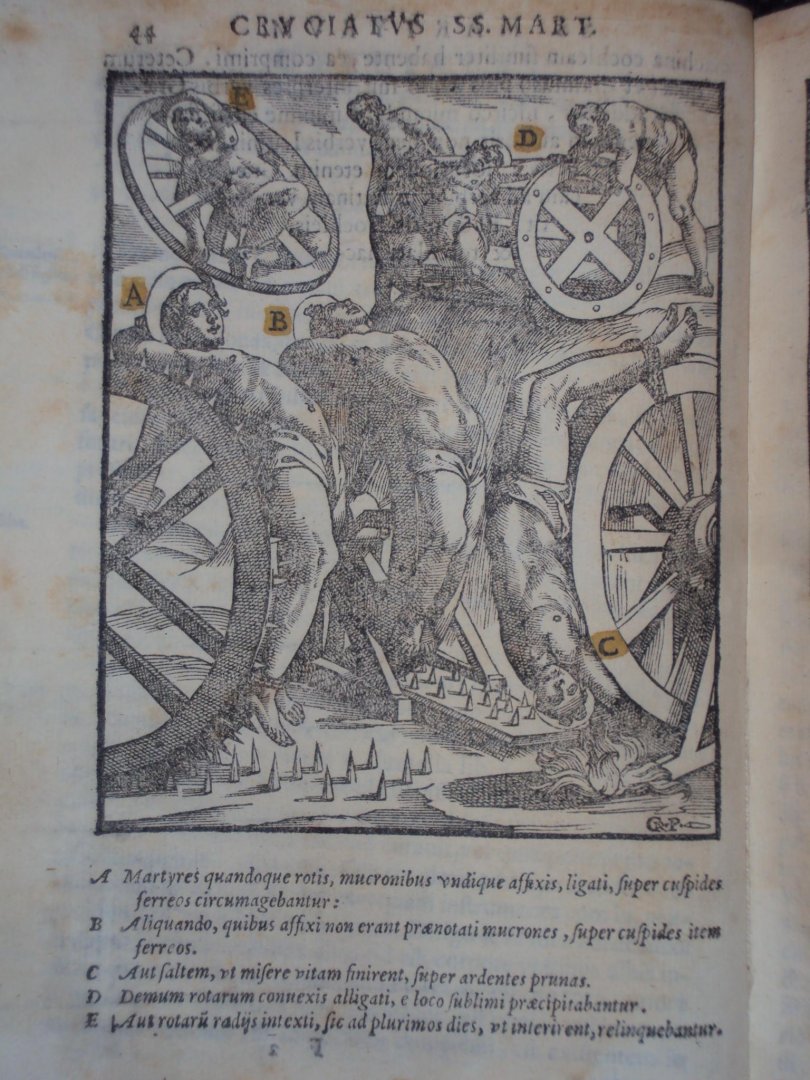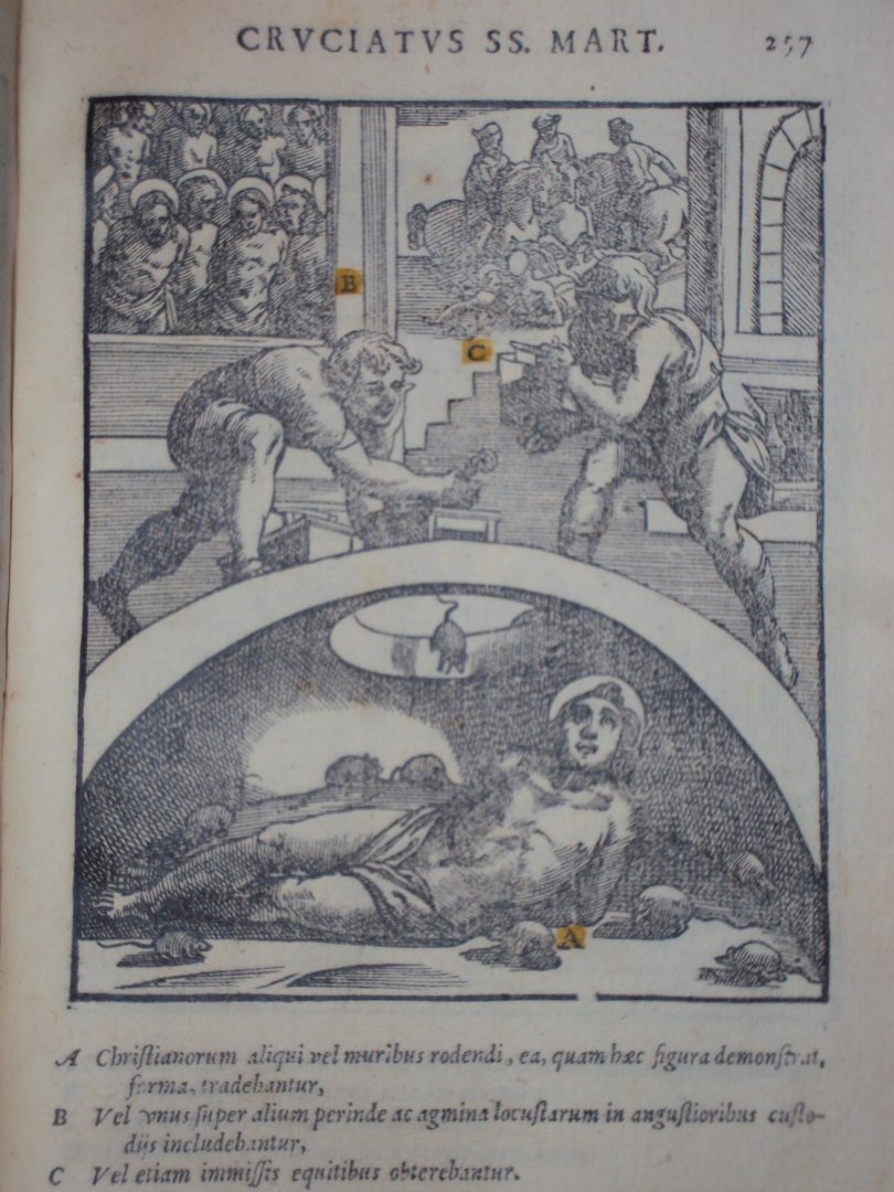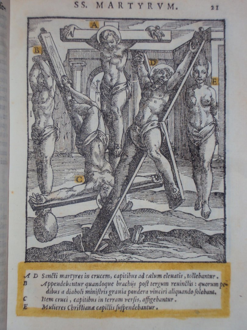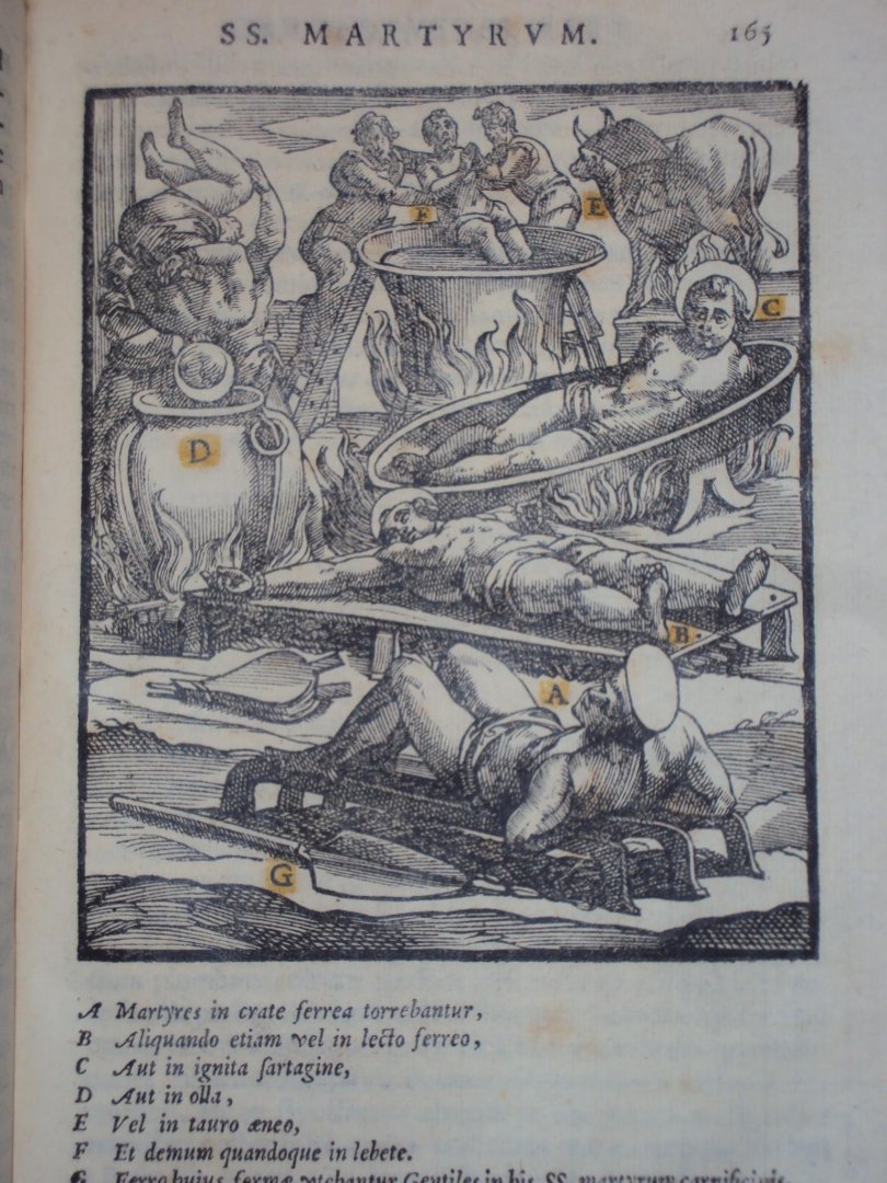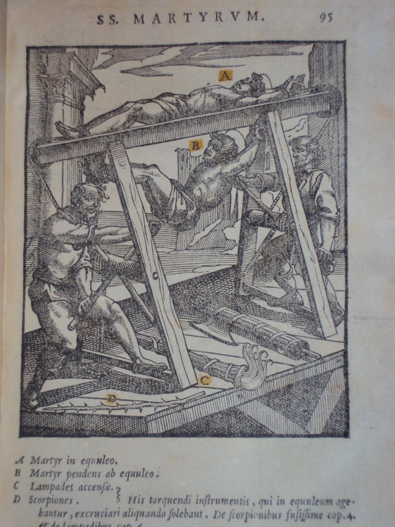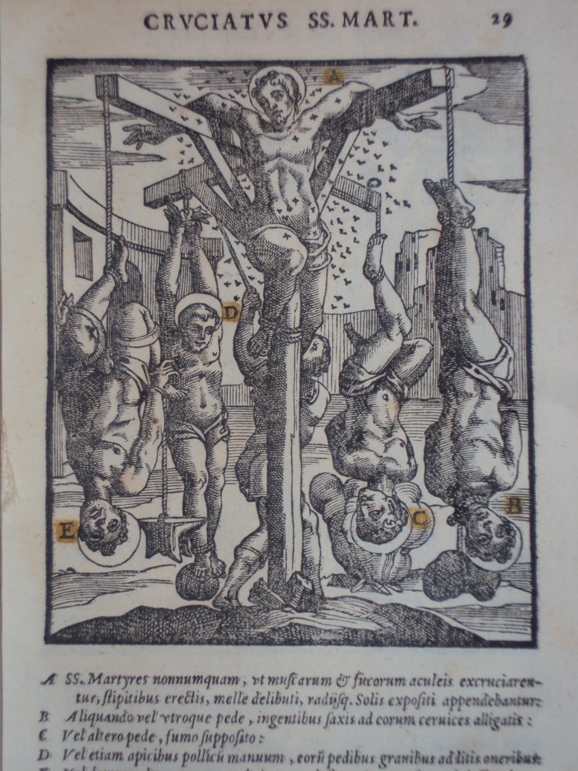 Antonius Gallonius - De SS martyrum cruciatibus - Rome, A. Zannetus, 1594 - (12),264,(28)pp - 25 almost full-p. woodcut ills. w. handcol. details - perkament / vellum band - 23 x 17 cm compleet met 25 gravures. Later herdrukt als Tortures and Torments of the Christian Martyrs |