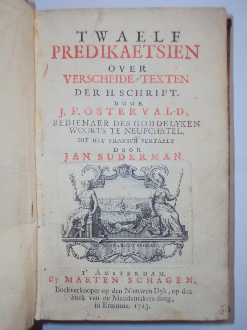 J.F. Ostervald - Twaelf Predikaetsien over verscheide texten der H. Schrift - Amsterdam, Marten Schagen, 1723 - 574 pp - perkament / vellum band - 16,5 x 11 cm J.F. Ostervald was bedienaer des Goddlyken woorts te Neufchatel |