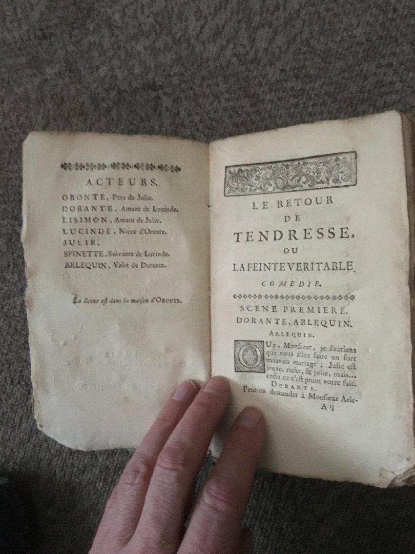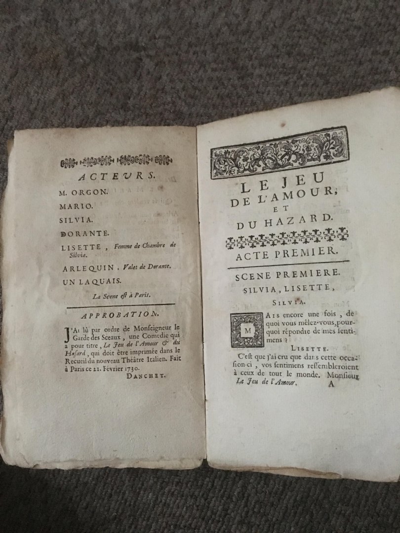 Briasson, Paris, 1733. Original edition Softcover. small 8° (19x11 cm). 52, 104, 116, 62 ,80 pp, and 4 pp music. Le Retour de Tendresse, ou La Feinte Veritable. Les Paysans de Qualité, et les Débuts. Le Jeu de l'Amour et du Hazard (Marivaux). Le Phenix . Les Amusemens a la Mode . Condition correct for book of 1733. Inside clean, outside a bit damaged, see photos. |