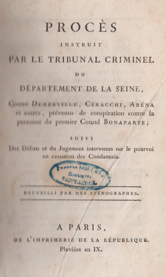 | Titel: | Procès instruit par le Tribunal Criminel du Département de la Seine contre Demerville, Ceracchi, Arena et autres, prévenus de conspiration contre la personne du premier Consul Bonaparte. Suivi Des Débats et du Jugement intervenes sur le pourvo... |