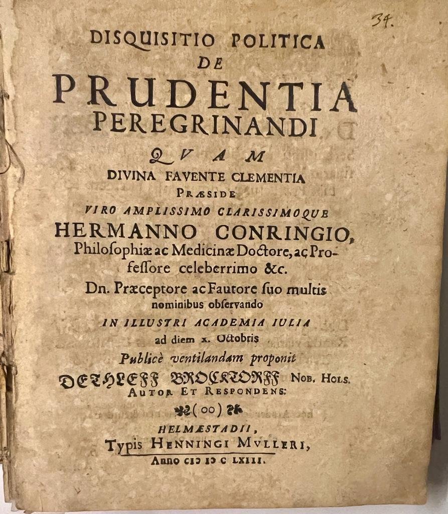 | Titel: | Dissertation 1663 I Disquisitio politica de prudentia peregrinandi [...] Helmstedt Henning Müller 1663. |