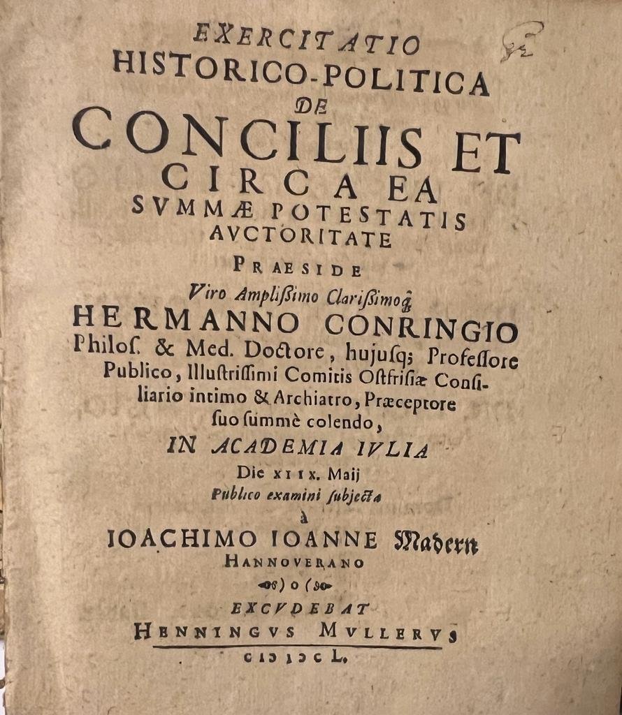 | Titel: | Dissertation 1650 I Exercitatio historico-politica de conciliis et circa ea summae potestatis auctoritate [...] Helmstedt Henning Müller 1650. |