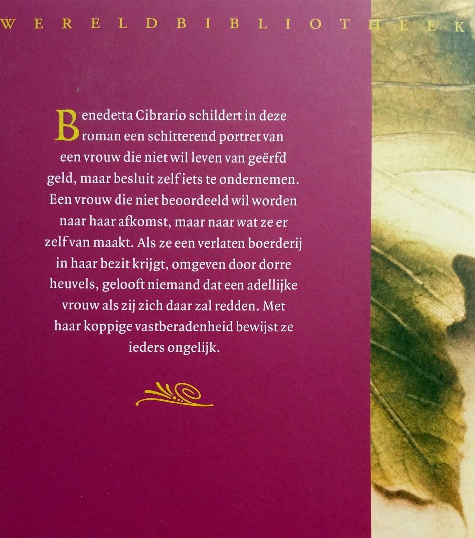 (Wereldbibliotheek - Amsterdam) ISBN 9789028422858 uitgave uit 2007 222 pp paperback met flappen (zo goed als nieuw!) Staat van het boek: 9.0 Benedetta Cibrario schildert in deze roman een schitterend portret van een vrouw die niet wil leven van geërfd geld, maar besluit zelf iets te ondernemen. Een vrouw die niet beoordeeld wil worden naar haar afkomst, maar naar wat ze er zelf van maakt. Als ze een verlaten boerderij in haar bezit krijgt, omgeven door dorre heuvels, gelooft niemand dat een adellijke vrouw als zij zich daar zal redden. Met haar koppige vastberadenheid bewijst ze ieders ongelijk. Prijs €4,50 |