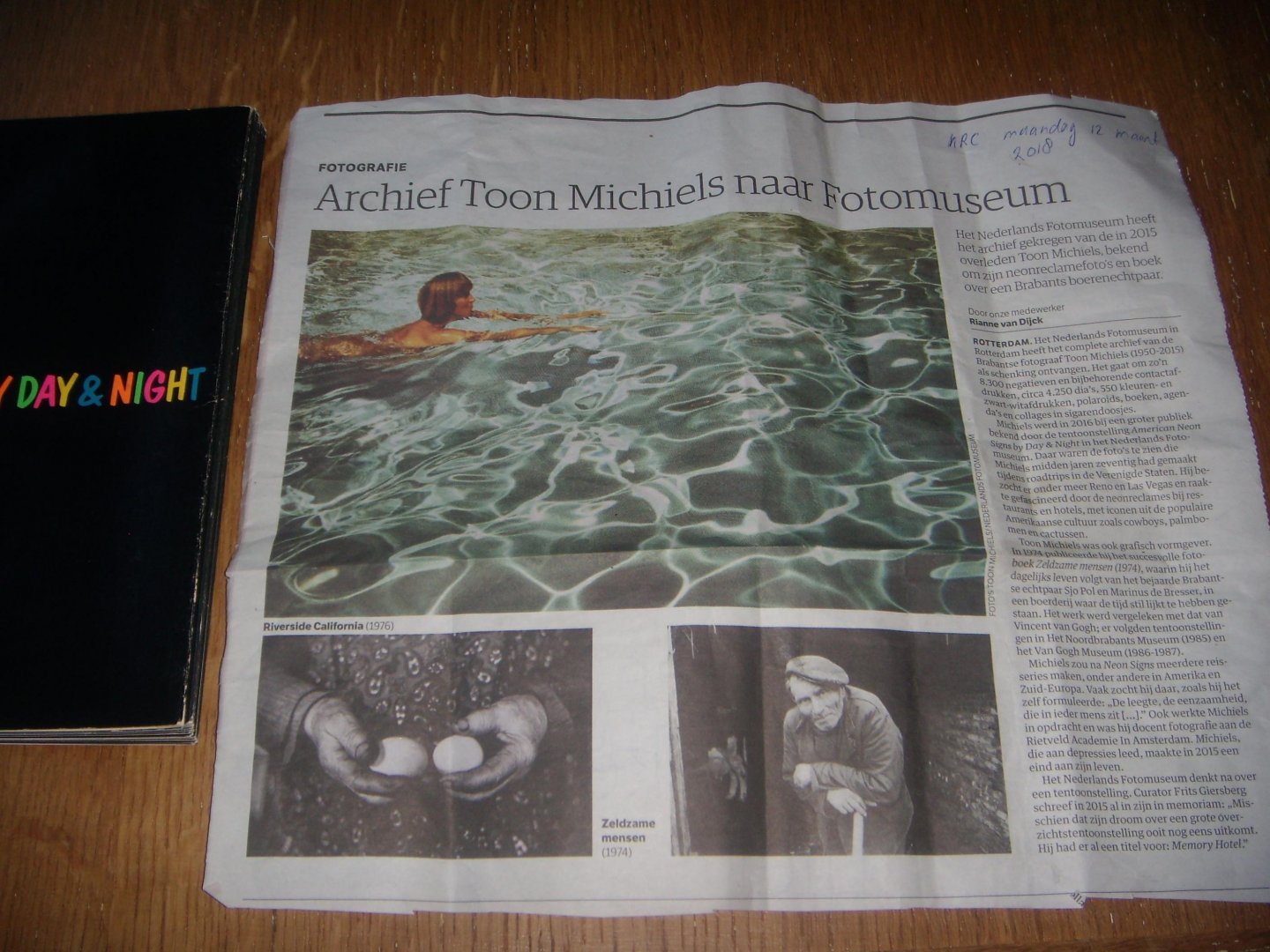 Boek bevat 30 foto’s van neonreclames die Toon Michiels in de tweede helft van de jaren zeventig in de Verenigde Staten maakte. Hij fotografeerde dezelfde objecten zowel overdag als s’nachts. In dit boek zijn beide opnamen steeds naast elkaar in een uitslaander geplaatst. Pas als de lezer de zwart bedrukt uitslaander opent, spettert het neon-geweld hem tegemoet; veertien keer. Een vijftiende duo zit verborgen onder de flap van het omslag. Krantenartikel uit NRC 12 maart 2018 (over archief Michiels naar Fotomuseum) |