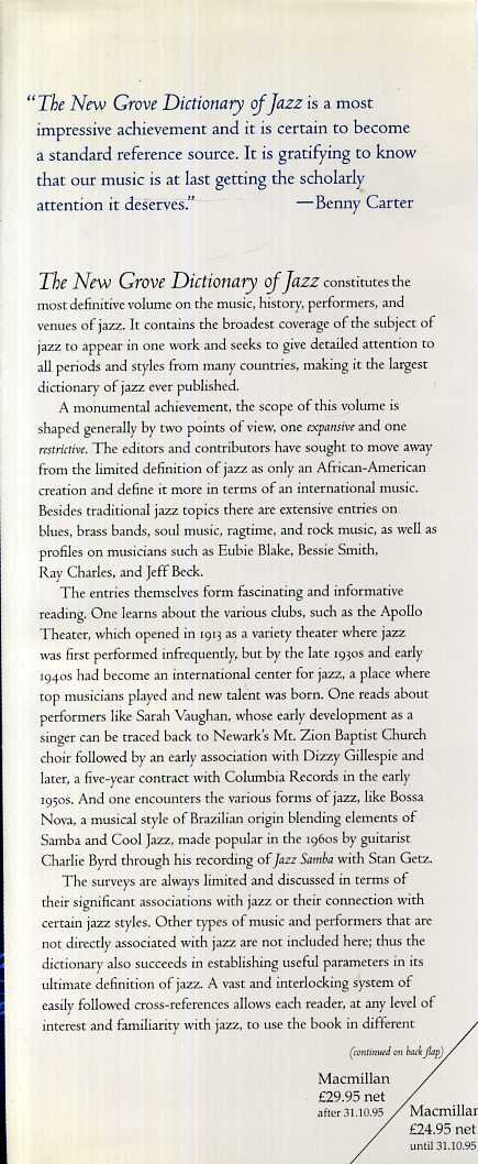 The world's most comprehensive simgle volume of jazz reference including performers, history, jazz terms and topics, instruments, styles, festivals, clubs, record labels and much more. With over 4500 articles, 1800 discographies, 1000 cross-references, 220 photographs and 100 music examples. A very heavy book.