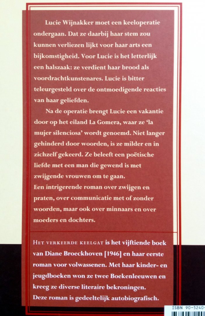 (Houtekiet - Antwerpen / Baarn) ISBN 9052404615 uitgave uit 1998 137 pp paperback (In goede staat!, licht leesspoor op de rug) Staat van het boek: 8.0 'Het verkeerde keelgat' is het vijftiende boek van Diane Broeckhoven (1946) en haar eerste roman voor volwassenen. Met haar kinder- en jeugdboeken won ze twee Boekenleeuwen en kreeg ze diverse literaire bekroningen. Deze roman is gedeeltelijk autobiografisch.Recensie(s)Lucie Wijnakker heeft cystes in haar keel. Deze zullen operatief verwijderd moeten worden, maar dat gaat gepaard met een groot risico: het verlies van haar stem. Voor Lucie is dat een schrikbeeld, juist ook omdat zij haar brood verdient met het houden van voordrachten. Na de operatie gaat ze, sprakeloos en alleen, op vakantie naar een Spaans eiland. Ze leert daar Jésus kennen, een man met een letterlijk nietszeggende autistische dochter; hij is het gewend om met zwijgende vrouwen om te gaan. Het verhaal van de hedendaagse Lucie wordt afgewisseld met veel cursief gedrukte flashbacks. Lucie heeft in haar jeugd ook vaak ervaren dat haar het zwijgen werd opgelegd. Het draait om communicatie en de vraag wat er overblijft als spraak wegvalt. De stijl is prachtig met hier en daar fijnzinnige humor en beeldende zinnen (‘een bescheiden applaus, gedempt door reuma, artrose en vastgehouden vocht’). Het slot is verrassend. Een makkelijk te lezen, mooie maar niet alledaagse roman. Prijs €4,- |