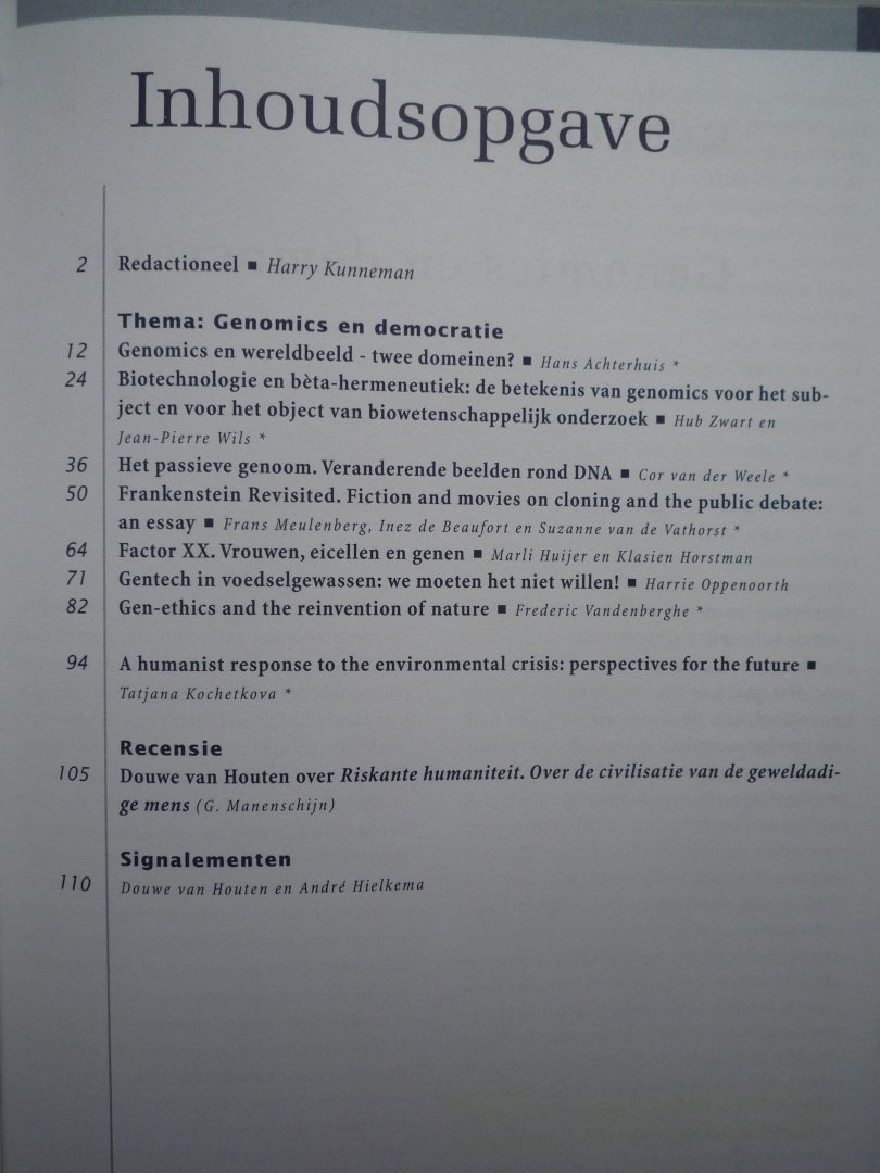 -Hans Achterhuis: Genomics en wereldbeeld - twee domeinen? -Cor vander Weele: Het passieve genoom. Veranderende beelden rond DNA -Marli Huijer en Klasien Horstman: Factor XX. Vrouwen, eicellen en genen -Harrie Oppenoorth: Gentech in voedselgewassen: we moeten het niet willen! |