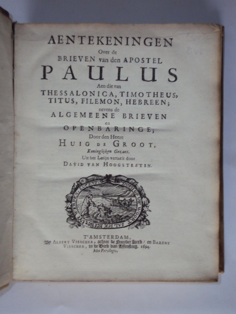 Vol I: Huig de Groot - Aentekeningen over het evangely van Mattheus. Met het leven des schrijvers - Gouda, Abraham van Loon, 1685 - 652 pp Vol II: Huig de Groot - Aentekeningen over de evangelien van Markus, Lukas en Joannes en de handelingen der Apostelen - Gouda, Abraham van Loon, 1688 - 840 pp Vol III: Huig de Groot - Aentekeningen over de brieven van den apostel Paulus aen die van Rome, Korinten, Galatie, Ephesen, Philippi en Kolossen - Amsterdam, Albert Visscher en Barent Visscher, 1693 - 594 pp Vol IV: Huig de Groot - Aentekeningen over de brieven van den apostel Paulus aen die van Thesslonica, Timotheus, Titus, Filemon, Hebreen. Nevens de algemeene brieven en openbaringe - Amsterdam, Albert Visscher en Barent Visscher, 1694 - 692 pp Alle delen gebonden in origineel en uniform perkament / vellum - 21 x 17 cm |