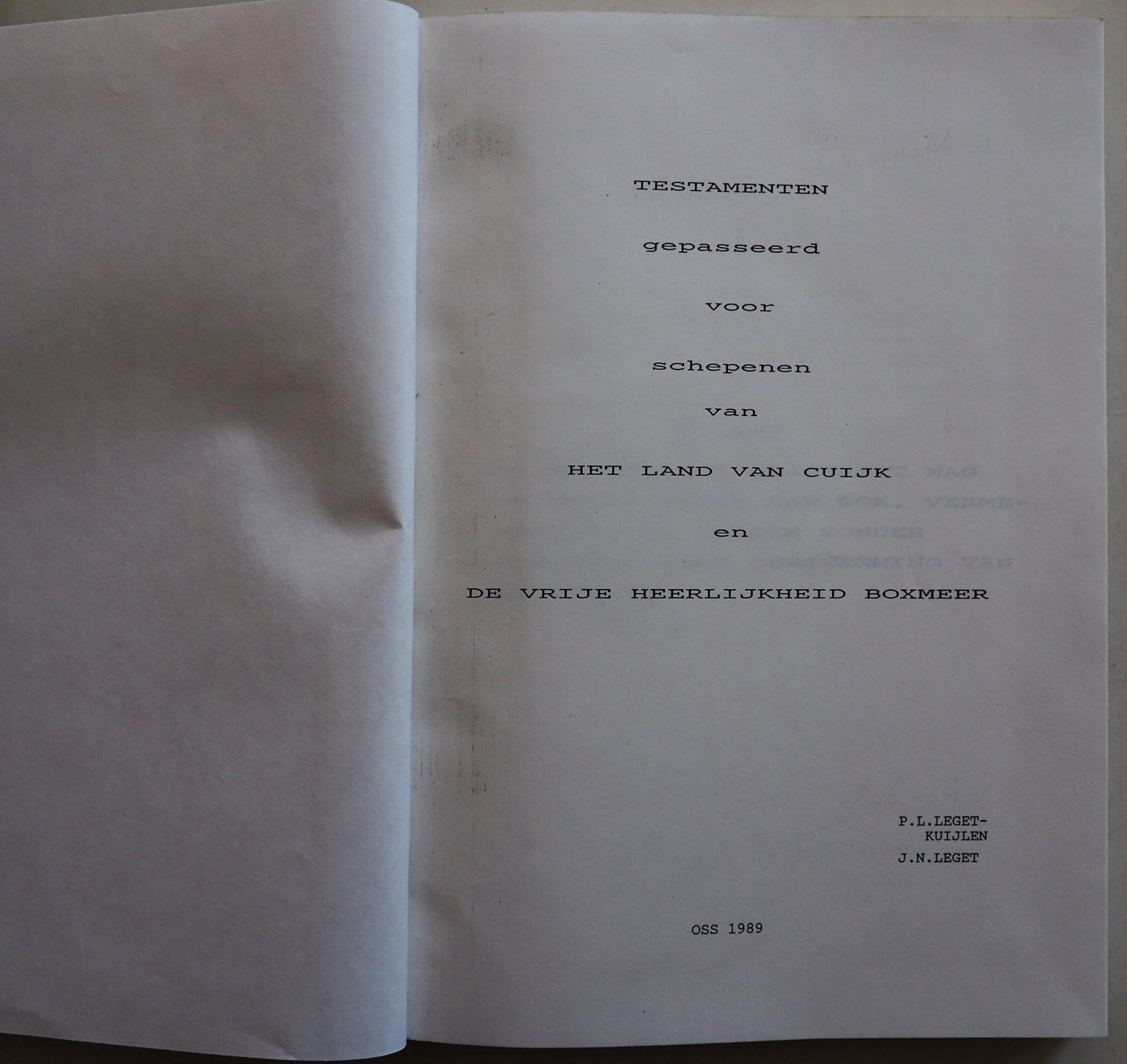 | Titel: | Testamenten gepasseerd voor Schepenen van het land van Cuijk en de Vrije Heerlijkheid Boxmeer |