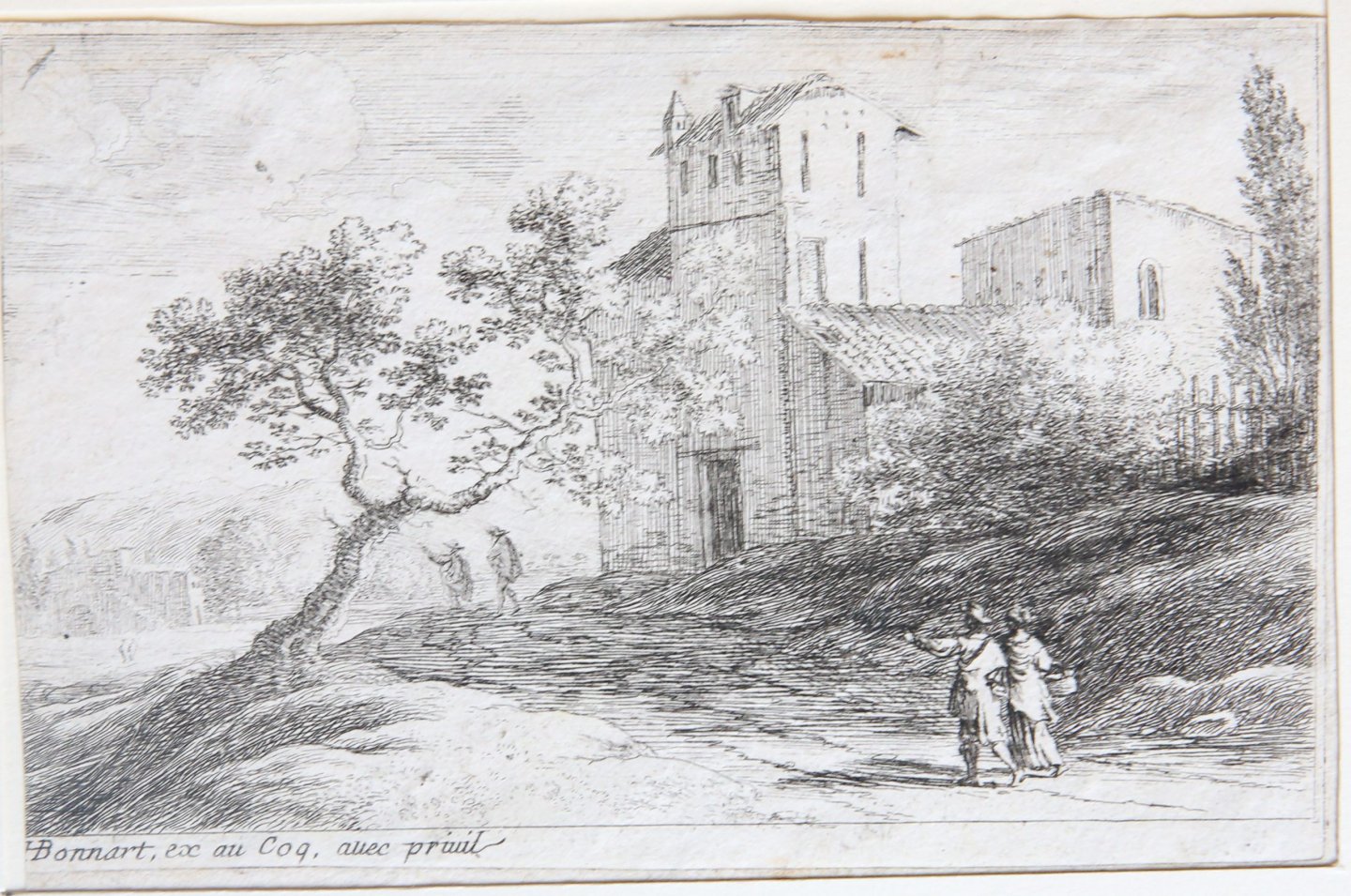 | Bijzonderheden: | A palace on the right; four figures walking on the path before it. In front of the palace, on the left, a large bending tree.Inscribed at the bottom left: HBonnart ex au Coq. avec privil.This etching belongs to a set of twelve views of Rome and be... |