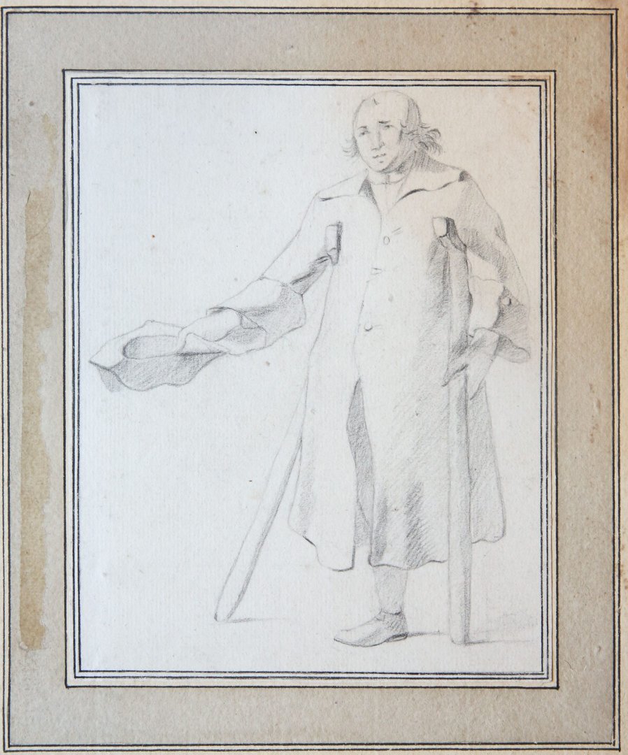 | Bijzonderheden: | A crippled man standing, begging for money with his hat in the right hand. Mounted on a cardboard mat on which was drawn a light frame. Under the drawing the monogram and the date: JAVL 1777; furthermore, a small number, 9, is drawn in pencil also... |