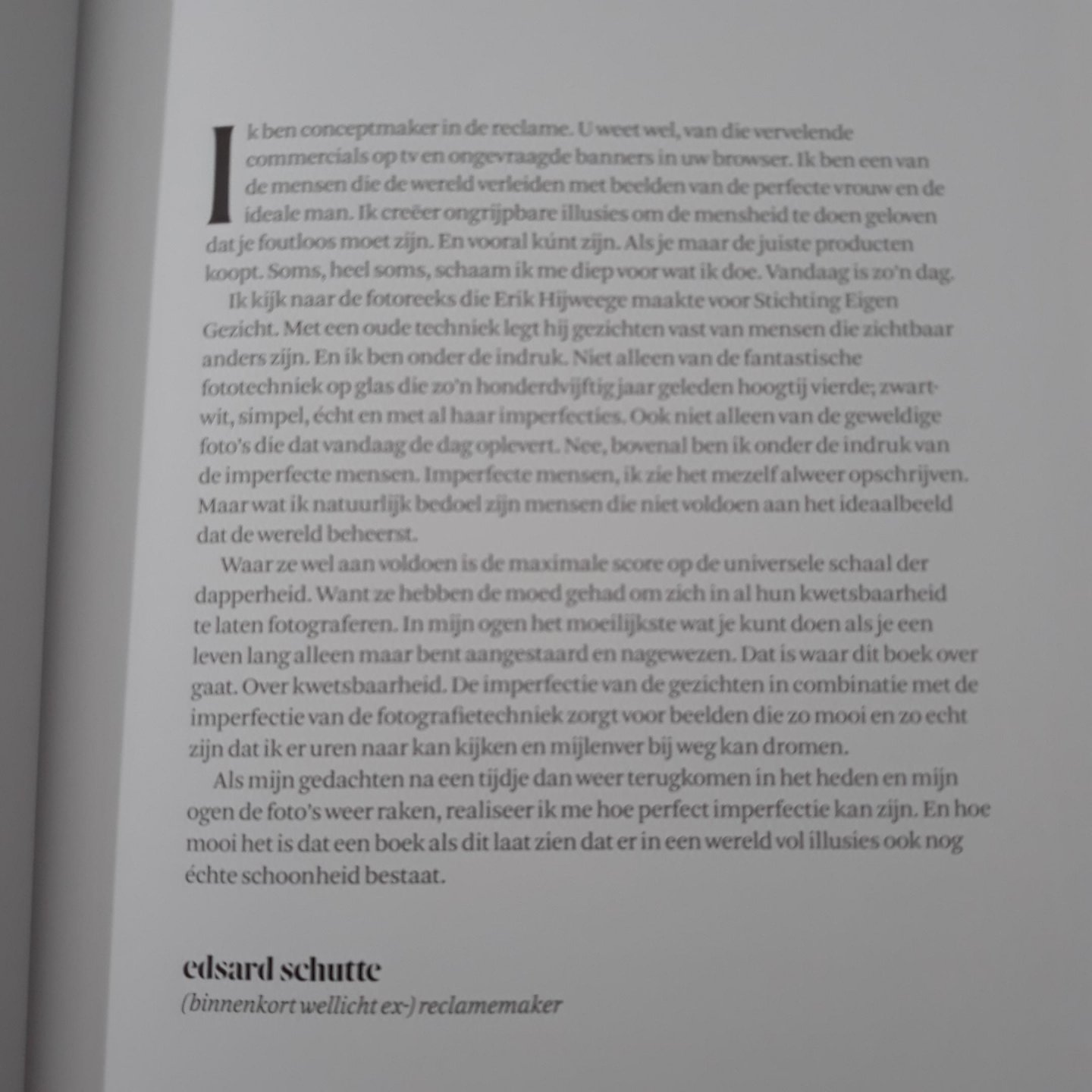 In heel Nederland leven 100.000 mensen met een afwijking aan hun gezicht. Zij voldoen niet aan het klassieke schoonheidsideaal en krijgen te maken met starende blikken en en wel heel directe opmerkingen. Fotgraaf Erik Hijwege laat met behulp van de 19de eeuwse mattecollodium-technieken zien hoe perfect imperfectie kan zijn. uit zijn indrukwekkende portretten blijkt dat ook in een wereld vol illusies echte schoonheid nog bestaat.