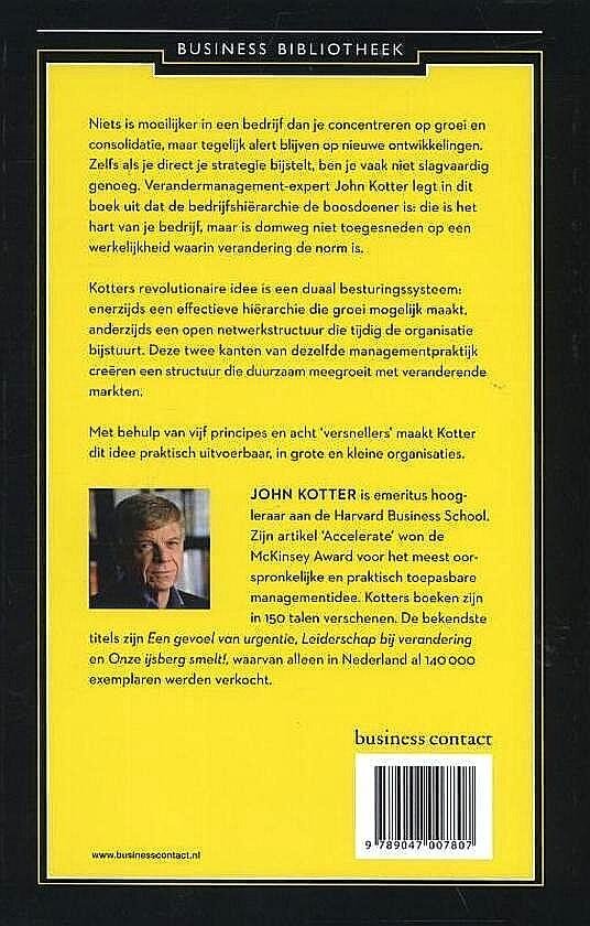 - ben je vaak niet slagvaardig genoeg. Verandermanagement-expert John Kotter legt in dit boek uit dat de bedrijfshi rarchie de boosdoener is: die is het hart van je bedrijf, maar is domweg niet toegesneden op een werkelijkheid waarin verandering de norm is.Kotters revolutionaire idee is een duaal besturingssysteem: enerzijds een effectieve hiërarchie die groei mogelijk maakt, anderzijds een open netwerkstructuur die tijdig de organisatie bijstuurt. Deze twee kanten van dezelfde managementpraktijk cre ren een structuur die duurzaam meegroeit met veranderende markten. Met behulp van vijf principes en acht 'versnellers' maakt Kotter dit idee praktisch uitvoerbaar, in grote en kleine organisaties.