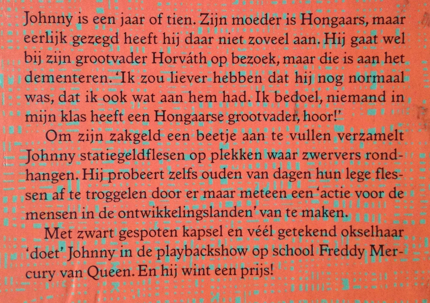 Johnny is een jaar of tien. Zijn moeder is Hongaars, maar eerlijk gezegd heeft hij daar niet zoveel aan. Hij gaat wel bij zijn grootvader Horváth op bezoek, maar die is aan het dementeren. Ik zou liever hebben dat hij nog normaal was, dat ik ook wat aan hem had. Ik bedoel, niemand in mijn klas heeft een Hongaarse grootvader, hoor! Om zijn zakgeld een beetje aan te vullen verzamelt Johnny statiegeldflessen op plekken waar zwervers rondhangen. Hij probeert zelfs ouden van dagen hun lege flessen af te troggelen door er maar meteen een 'actie voor de mensen in de ontwikkelingslanden' van te maken. Met zwart gespoten kapsel en véél getekend okselhaar 'doet' Johnny in de playbackshow op school Freddy Mercury van Queen. En hij wint een prijs! |