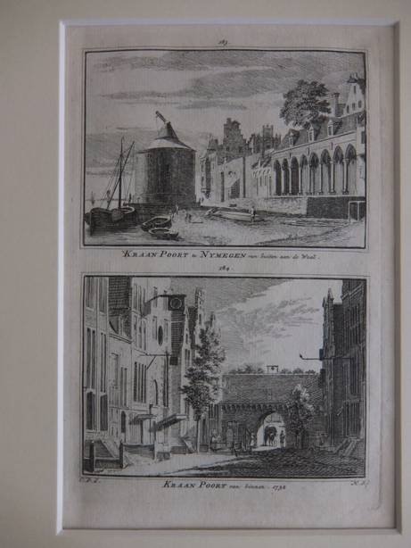 | Titel: | Kraan Poort te Nymegen van buiten aan de Waal/ Kraan Poort van binnen, 1732. |