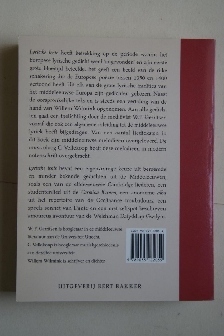 | Titel: | LYRISCHE LENTE liederen en gedichten uit het Middeleeuwse Europa vertaald door Willem Wilmink gekozen en toegelicht door W.P.Gerritsen Met transscripties v.d. melodieen door C. Vellekoop |