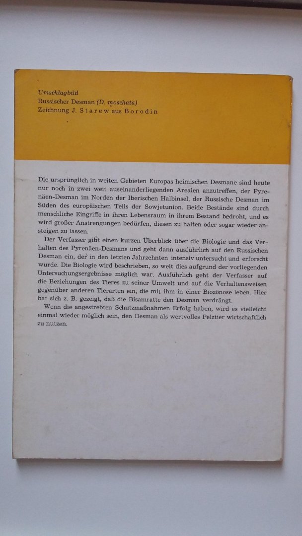 Zeer bijzonder boekje over een niet al te bekende diersoort: De Russische Desman - Desmana moschata - Behorende tot de watermollen - onderfamilie van de mollen. In zeer redelijke staat |