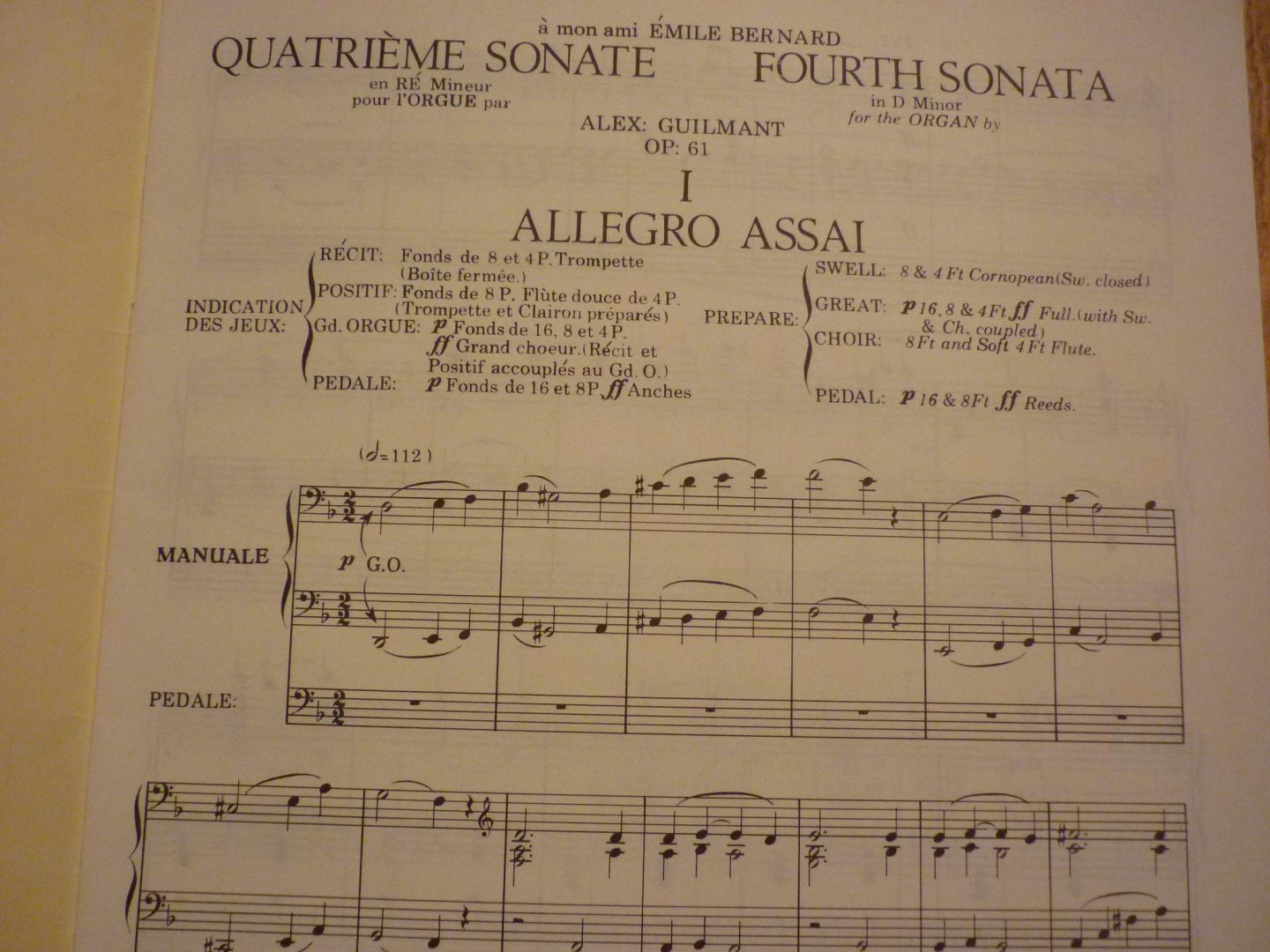 I. Allegro assai II. Andante III. Menuetto: Allegretto IV. Finale: Adagio-Allegro vivace con fuoco Charles-Marie Widor founded the French form called Symphony for Organ; large-scale, academically 'sonata form' works of great power, often containing a toccata-like conclusion. Guilmant continued the development of such works, although he called his eight works in the form sonatas. This is his work Quatrieme Sonate from Opus 61, for Organ Solo. |