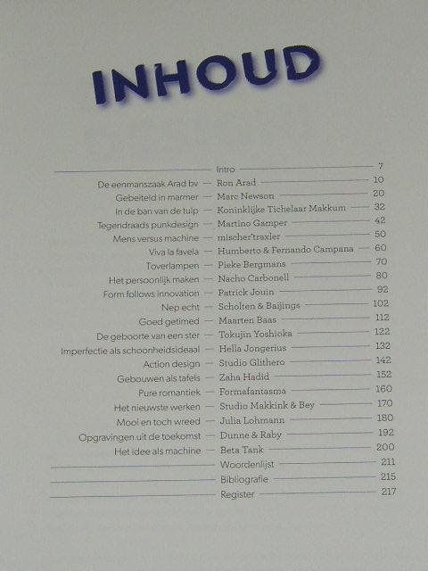 Design gaat niet meer alleen over gebruiksvoorwerpen. Het is ook een barometer die peilt wat de wensen en verlangens van de samenleving zijn. Door in een stoel of een vaas meer te zien dan een object, door er een verhaal bij te vertellen is vormgeving, zoals Jeroen Junte in zijn inleiding van dit boek schrijft, toegetreden tot de 'high culture'. Aan de hand van twintig objecten en de makers daarvan worden de verhalen over wat de functie van ontwerpen is verteld. Pieke Bergmans bijvoorbeeld vertelt over de relatie tussen haar lampen en het dadaïsme en surrealisme. De lampen in deze ontwerpen lijken als lava uit hun armatuur te komen. Maarten Baas probeert in zijn klokken het verstrijken van de tijd uit te beelden, in plaats van een tijdstip, en in de vazen van Studio Glithero wordt een langgerekte saxsolo van Charlie Parker verbeeld. Opvallend aan deze ontwerpen is dat nostalgie en droomwereld heel goed te combineren zijn in ultramodern ontwerp. |