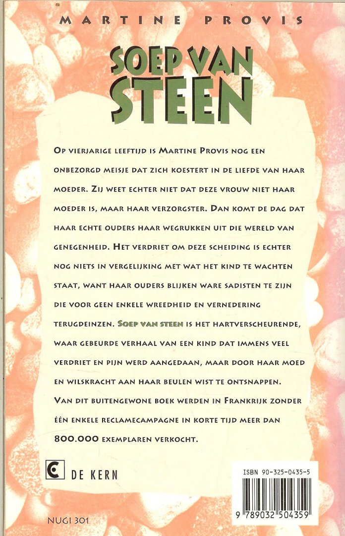 Op 4 jarige leeftijd is Martine Provis nog een onbezorgd meisje dat zich koestert in de liefde van haar moeder. Zij weet echter niet dat deze vrouw niet haar moeder is, maar haar verzorgster. Dan komt de dag dat haar echte ouders haar wegrukken uit de wereld van genegenheid. Het verdriet om deze scheiding is echter nog niets in vergelijking met wat het kind te wachten staat, want haar ouders blijken ware sadisten te zijn die voor geen enkele wreedheid en vernedering terugdeinzen. 'Soep van steen' is het hartverscheurende, waar gebeurde verhaal van een kind, dat immens veel verdriet en pijn werd aangedaan, maar door haar moed en wilskracht aan haar beulen wist te ontsnappen. Van dit buitengewone boek werden in Frankrijk zonder een enkele reclamecampagne in korte tijd meer dan 800.000 exemplaren verkocht. ISBN 9789032504359
