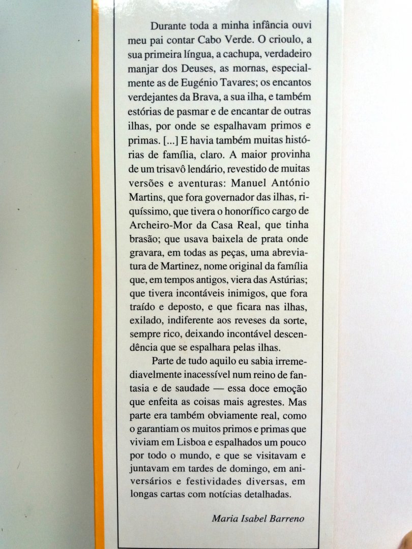 (Embaixada de Portugal / Centro Cultural Portugues - Praia / Mindolo) uitgave uit 1998 335 pp paperback met flappen (naam voorin, verder als nieuw) Staat van het boek: 9.0 Um pequeno extracto, deste belo livro de Maria Isabel Barreno, para deliciar os leitores: «Para relatar a história dos meus, e a minha, as linhas que vieram determinando e colorindo nossas existências e também essas escuras cavernas do tempo que a memória não consegue explorar, recorrerei a todos os relatos que ouvi e li. Mas usarei sobretudo a minha imaginação, porque só essa luz de cada um de nós ressuscita os mortos e as sombras do passado. Meu pai julgava crer que a luz maior era a do raciocínio, mas este apenas nos conduz a um mapa, a um olhar distante. Penetrar a carne macia dos acontecimentos, o pulsar sanguíneo de cada segundo tal como de facto existiu nas veias de cada um, só é possível com essa parente etérea do amor, com esse espelho transparente e sublimado de nossas paixões, a imaginação.» Prijs €9,50 |