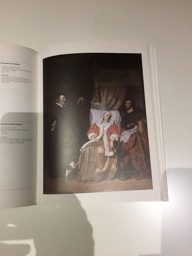 De bij de reproducties behorende tekst is zowel in de Nederlandse als in de Engelse taal afgedrukt. Museum de Hermitage leende 'Nederland' 41 schilderijen voor deze tentoonstelling. Wie 'Hermitage' zegt, zegt adembenemende schoonheid van kunst. Iets nu al om straks bij 'het zien' te watertanden. 'Voorwoord Met dankbaarheid en trots halen wij de gasten binnen uit Leningrad: de 41 schilderijen uit het ontzagwekkend bezit aan kunstwerken van het museum de Hermitage. Tussen de musea van de wereld is dat van de Hermitage een baaierd, een gigant, een oceaan of welke andere term men wil om aan te duiden dat dit museum uit de uiteenlopendste tijdperken en ver uiteenliggende cultuur- gebieden zijn collectie heeft samengesteld gedurende twee eeuwen en vóór en na de socialistische revolutie. Van Byzantijns zilver, tot Scythisch goud, van Griekse en Romeinse sculpturen tot de verfijnste kostbaarheden uit het nabije en verre oosten en van Italiaanse schilderkunst tot de schilderijen van Cézanne en Picasso. Daarbinnen vormt de collectie van Hollandse schilderkunst een tamelijk stil gebied. Ook daar hangen majes-tueuze schilderijen, vooral de figuurstukken van Rembrandt, (..). dr. W.A.L. Beeren Directeur'. |