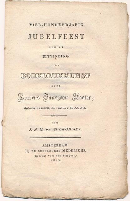 ![[Laurens Janszoon Coster] - Sulkowski, J. A. M. de - Vier-honderd jarig jubelfeest van de uitvinding der boekdrukkunst door Koster gevierd te Haarlem den 10den en 11den July 1823. [Laurens Janszoon Coster] - Sulkowski, J. A. M. de - Vier-honderd jarig jubelfeest van de uitvinding der boekdrukkunst door Koster gevierd te Haarlem den 10den en 11den July 1823.](https://images.boekwinkeltjes.nl/medium/3XvyUEB0WTWNlPXfQMbC.jpg)