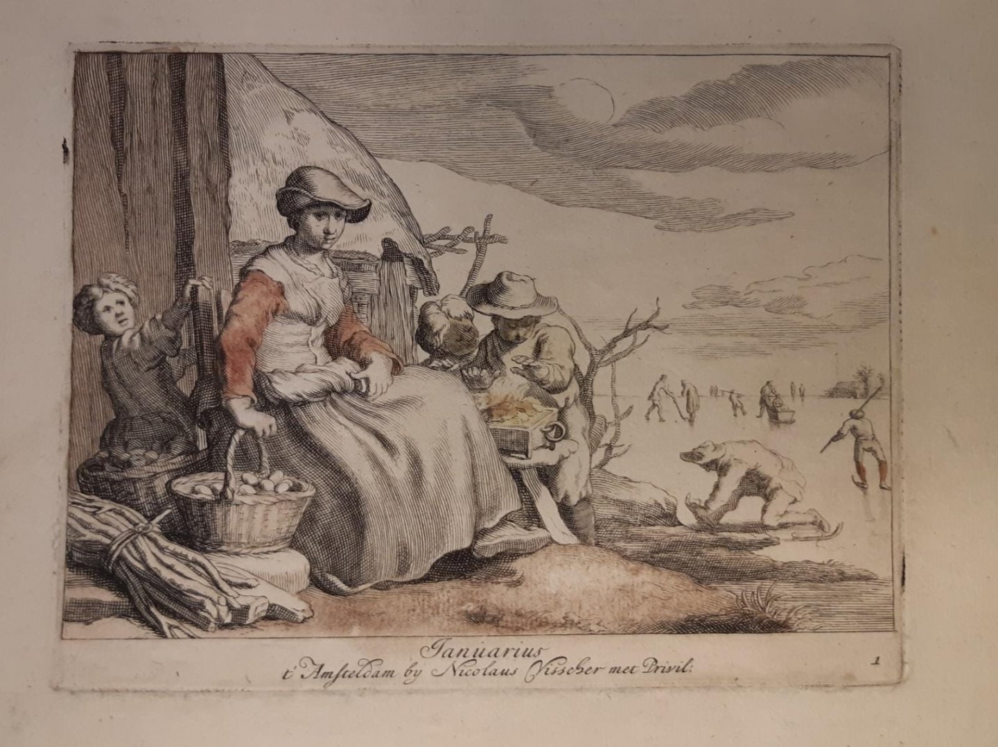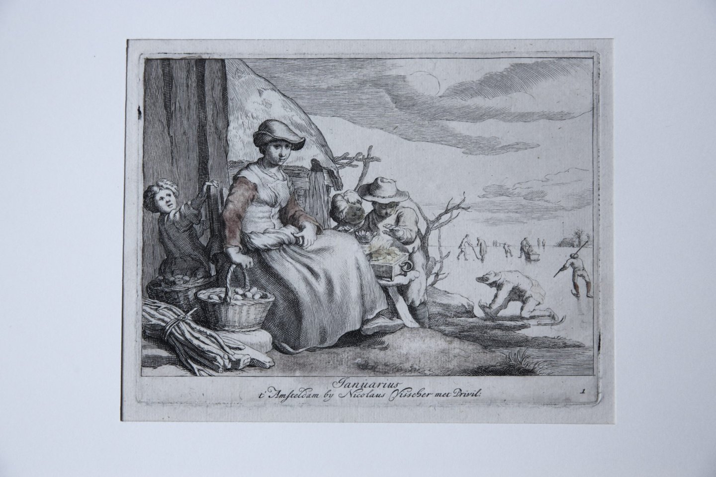 | Bijzonderheden: | Allegorical representation of the month of January.A young woman is sitting on the left, surrounded by three children, two warming up their hands on some coal. On the right, a frozen canal with skaters (schaatsers op het ijs).Signed and titled bel... |