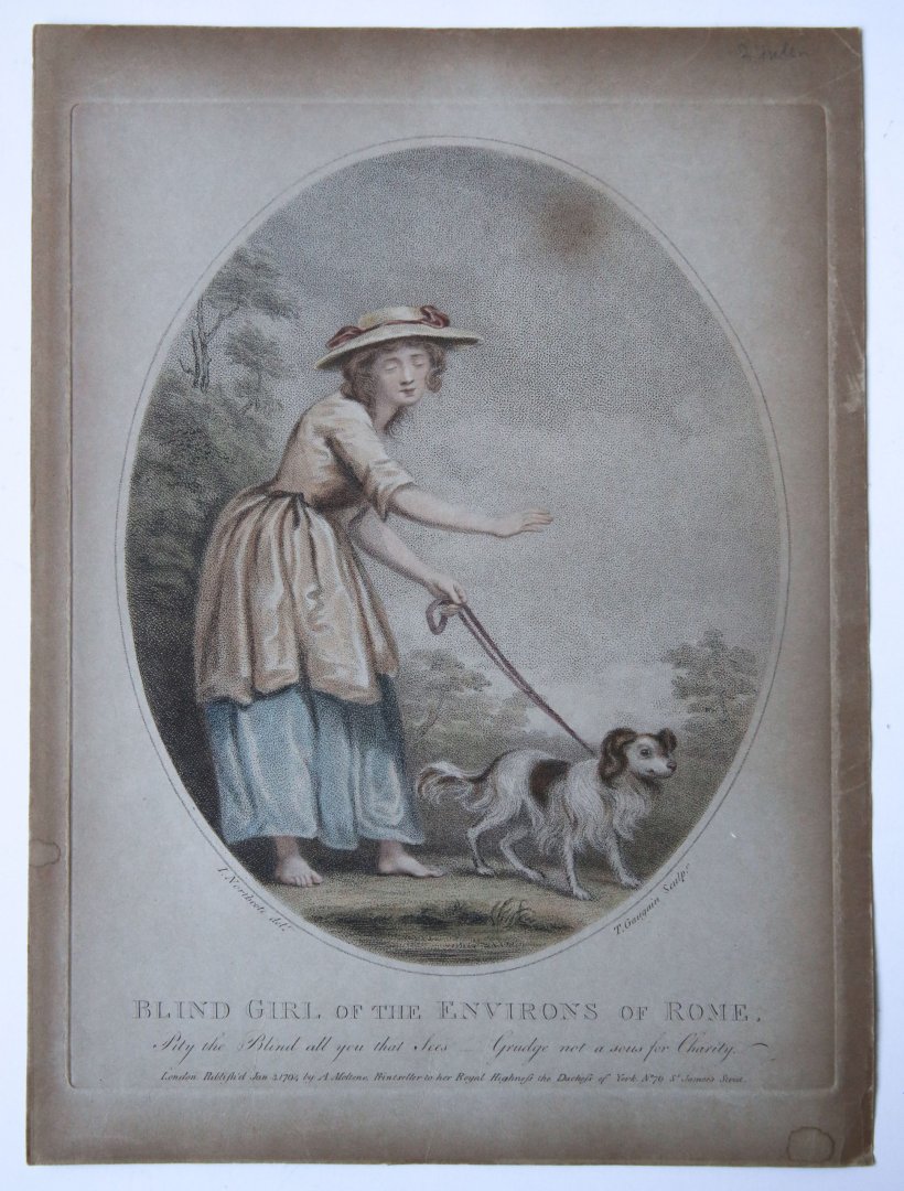 | Bijzonderheden: | A young girl walking bare foot to the right with her hand extended to feel her way, led by a dog; oval design. Lettered below image with title, verse: "Pity the Blind all you that Sees, Grudge not a sous for Charity", production detail: "I. Northc... |
