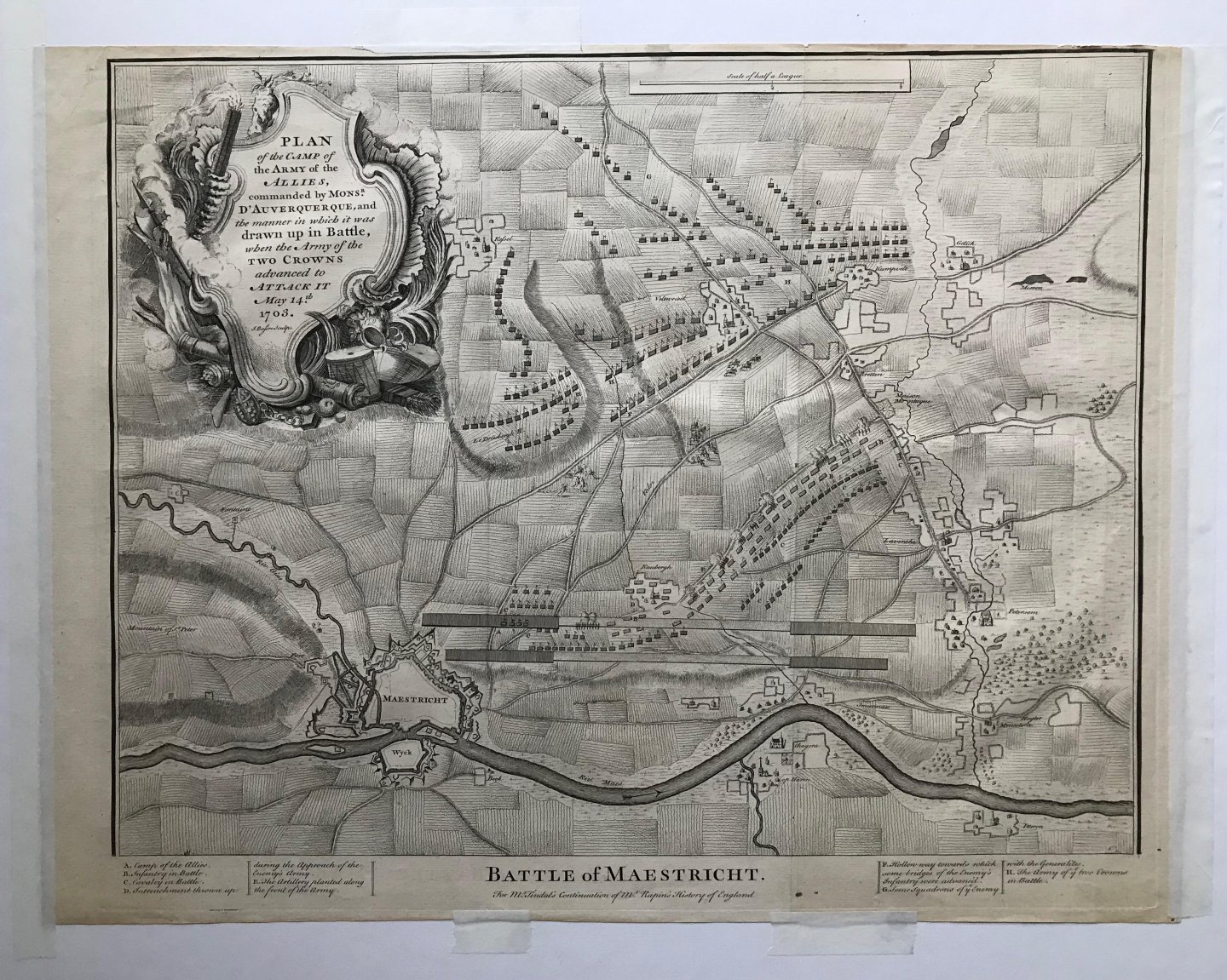 Net en strak met minimale gebruikssporen kopergravure van het beleg van Maastricht met disposities van legereenheden.. Afmeting: 39,5 x 48,5 cm. Gravure uit " Tindall's continuation of Rapin's history of England c.a. 1733 |