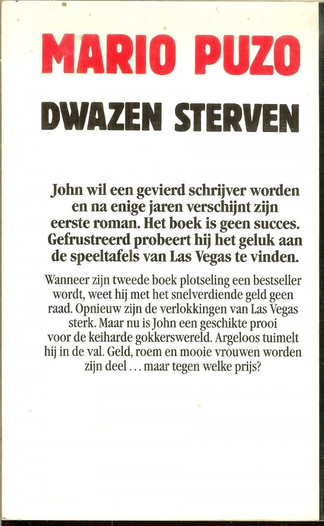 Omslagontwerp Anthon Beeke en Associates Gebruikers Sporen en Geel verkleuring Vertaling J. Nieuwenhuizen Een zakenman, een schrijver en een beroepsgokker ontmoeten elkaar in het casino van Las Vegas en sluiten vriendschap. De zakenman pleegt zelfmoord na weken achtereen als een bezetene te hebben gespeeld |
