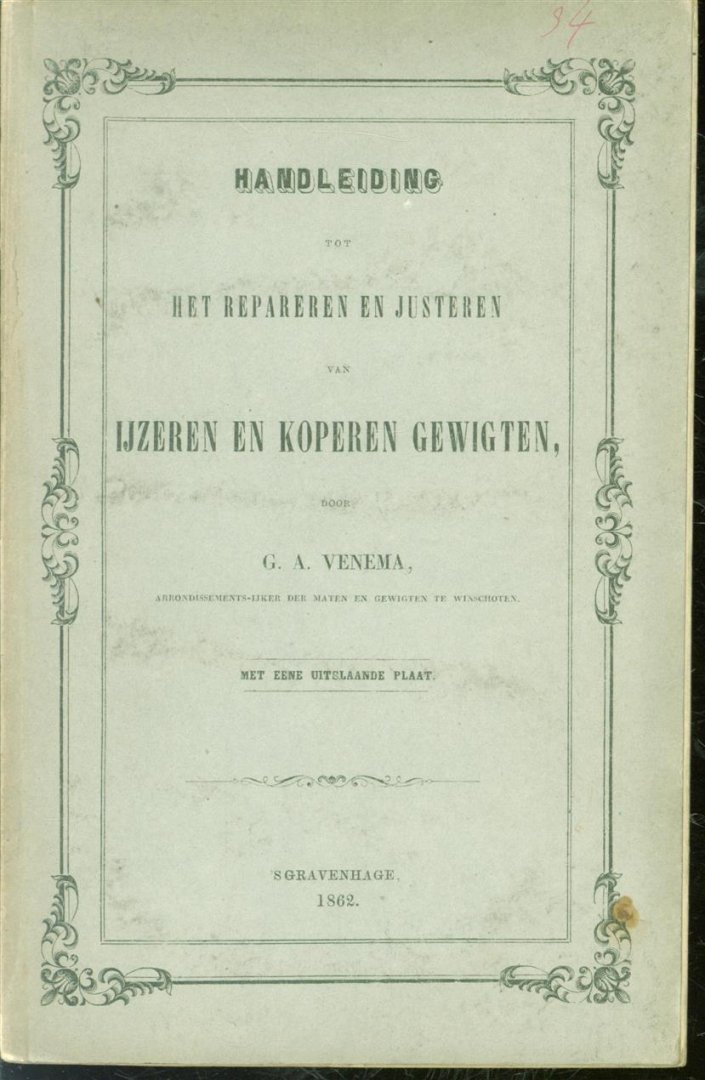 | Bijzonderheden: | 1862, Zeer goed, door G.A. Venema 50 Pagina's., original printed boards. 1 folding lithographed plate. very good fine condition. Very scarce work on the repair and calibration of weigths |