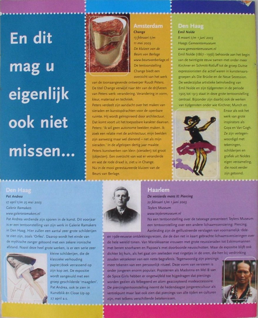 | Bijzonderheden: | maart 2003, softcover bindwijze geniet 21o x 260 x 2 mm. 19 pag. fc. ill. gew. ca 80 gr |